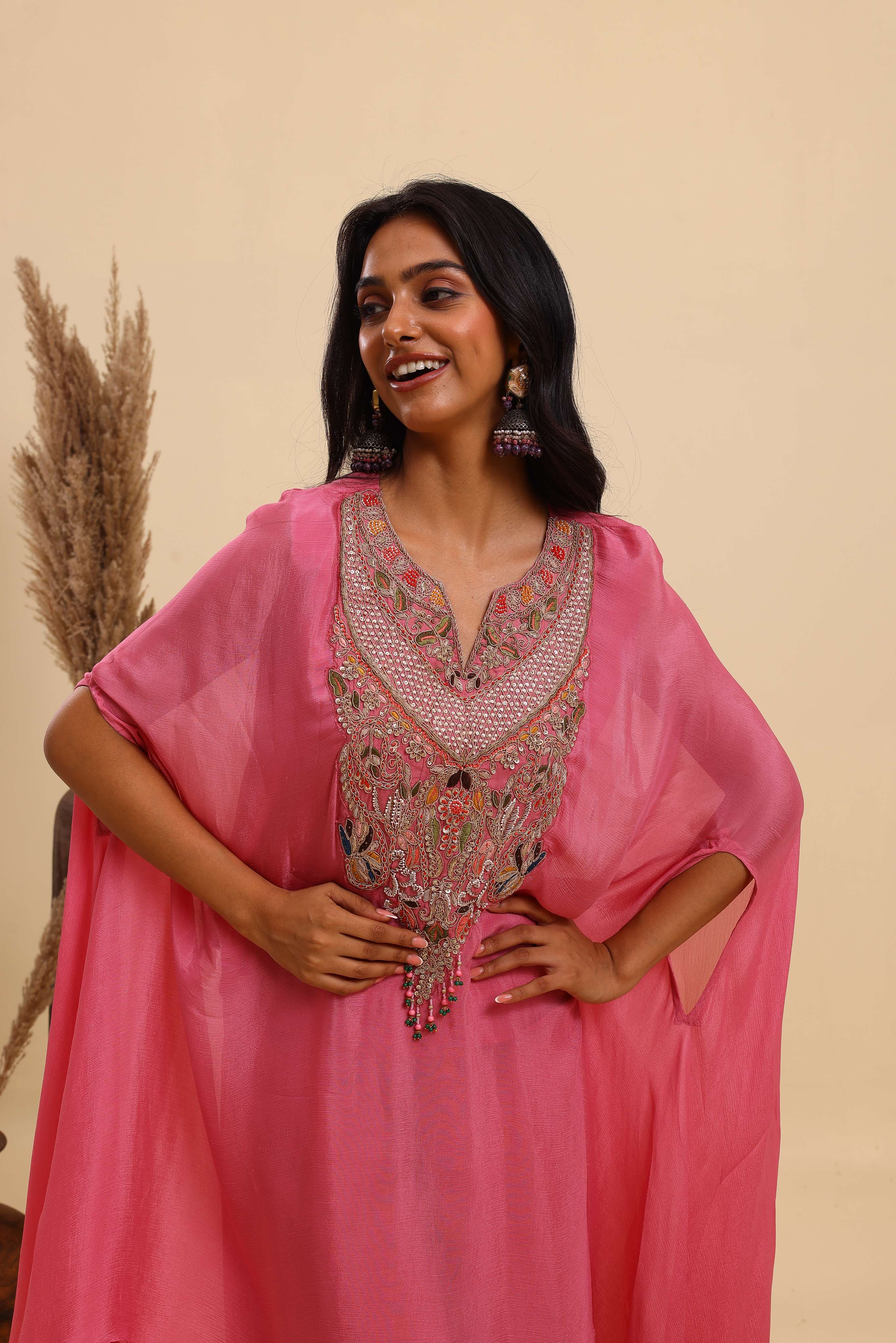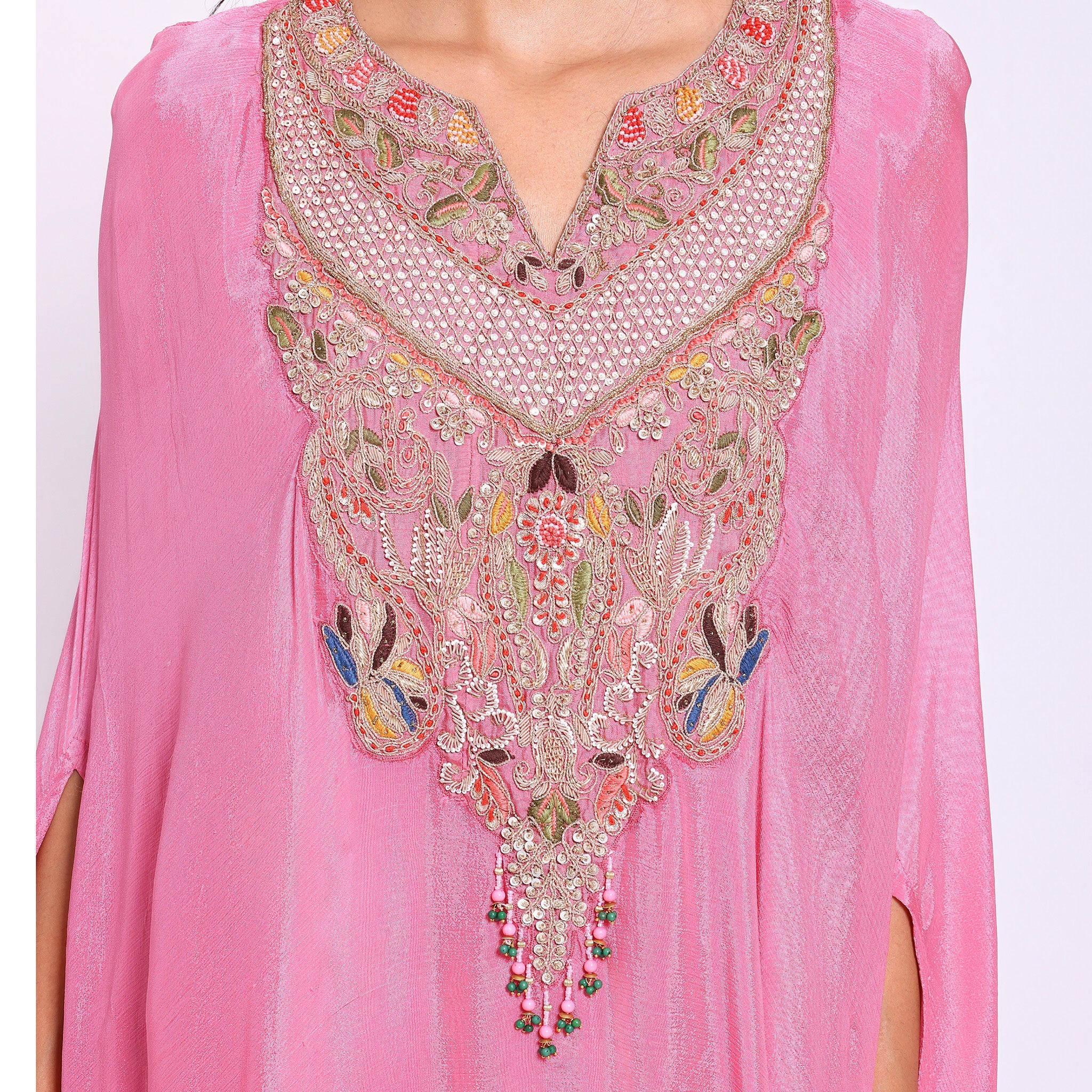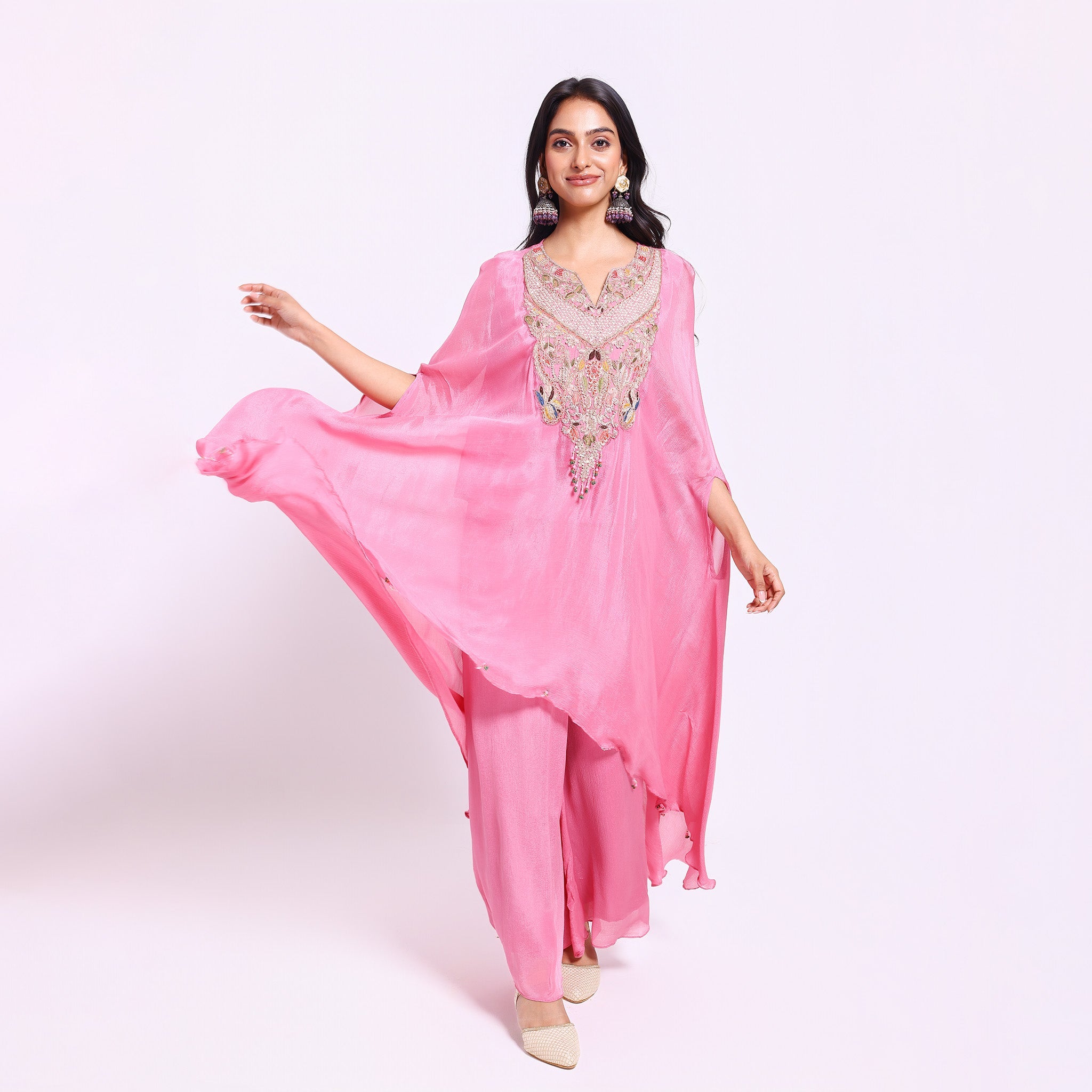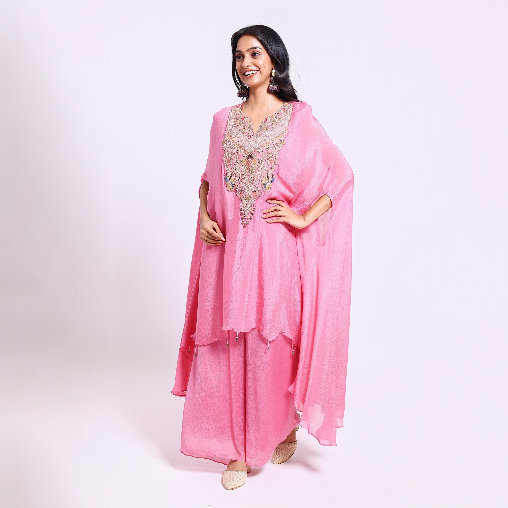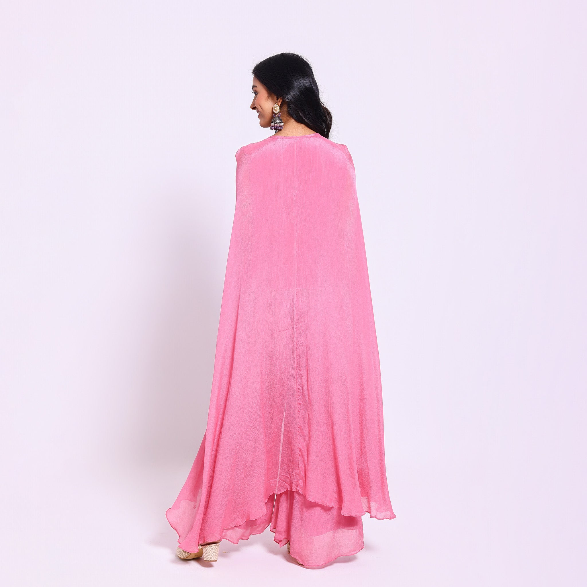 This elegant pink ensemble features a flowy, asymmetrical cape-style kurta crafted from a soft, shimmery fabric that drapes beautifully for a graceful silhouette. The highlight of the outfit is its intricately embellished neckline, adorned with dazzling beadwork, sequins, and delicate embroidery in gold, blue, and blush tones, creating a rich and regal look.