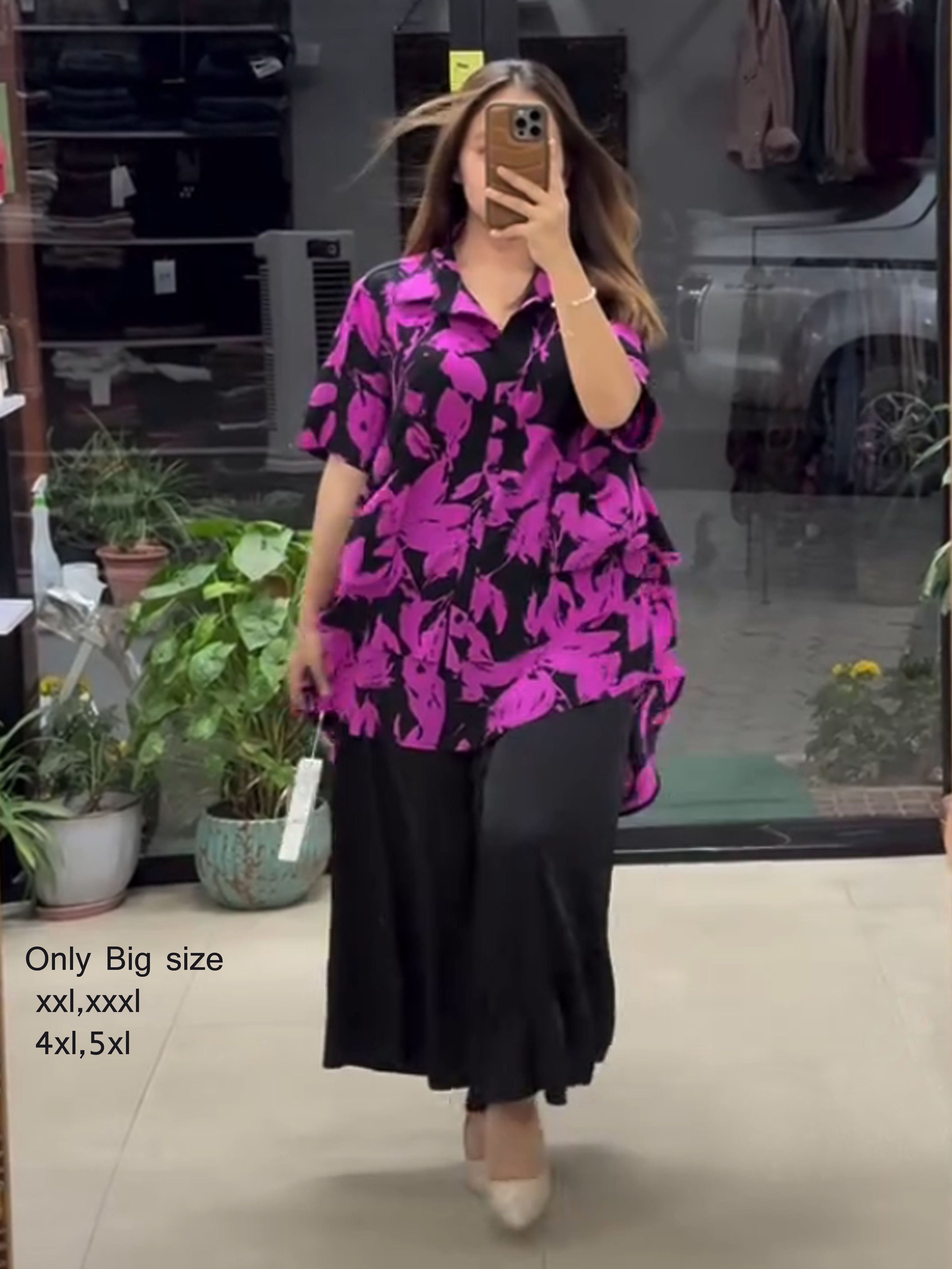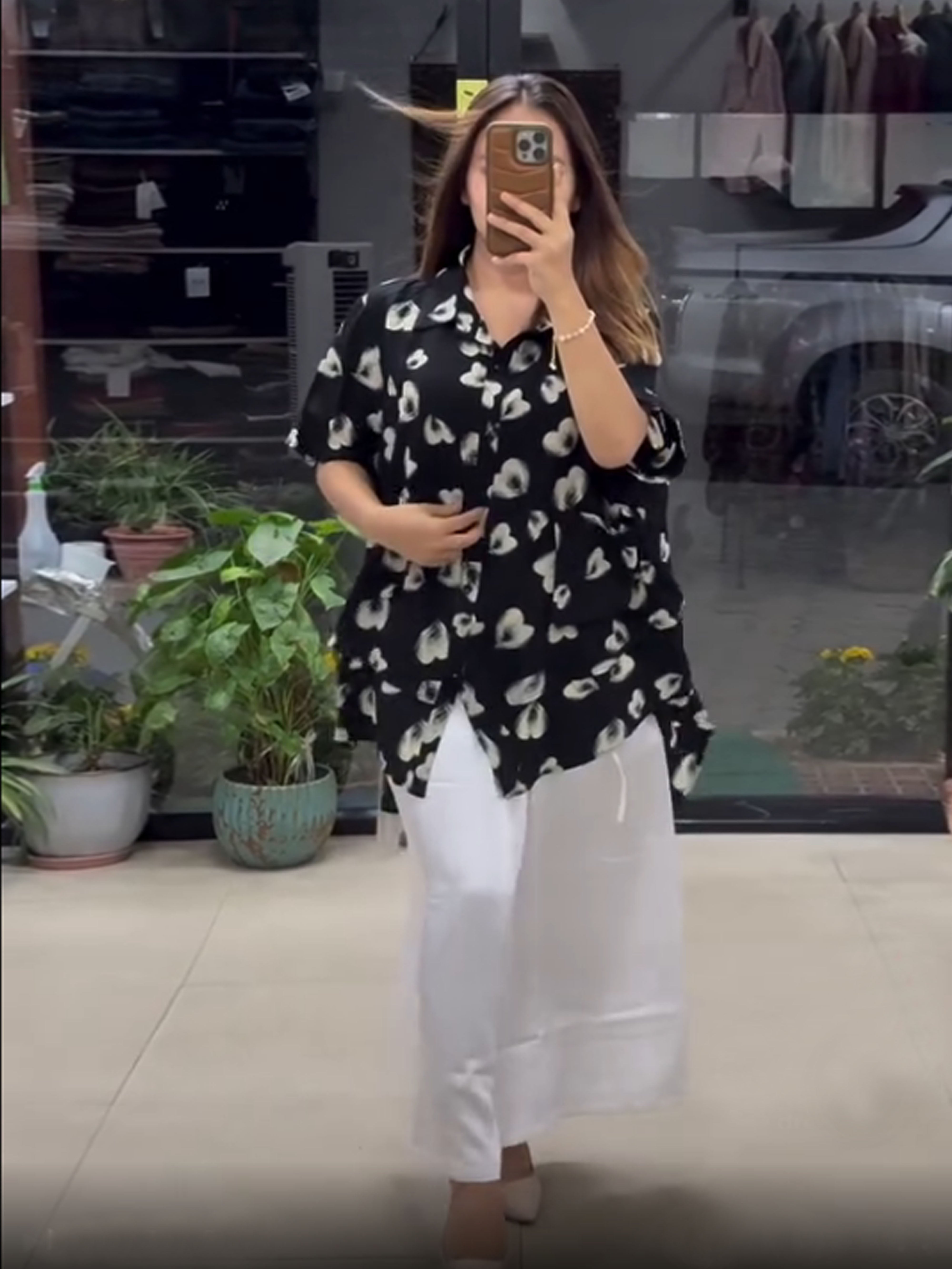 The OLIVIA Shirt-Style Dress features a printed top and matching palazzo pants, crafted from soft, flowing georgette fabric