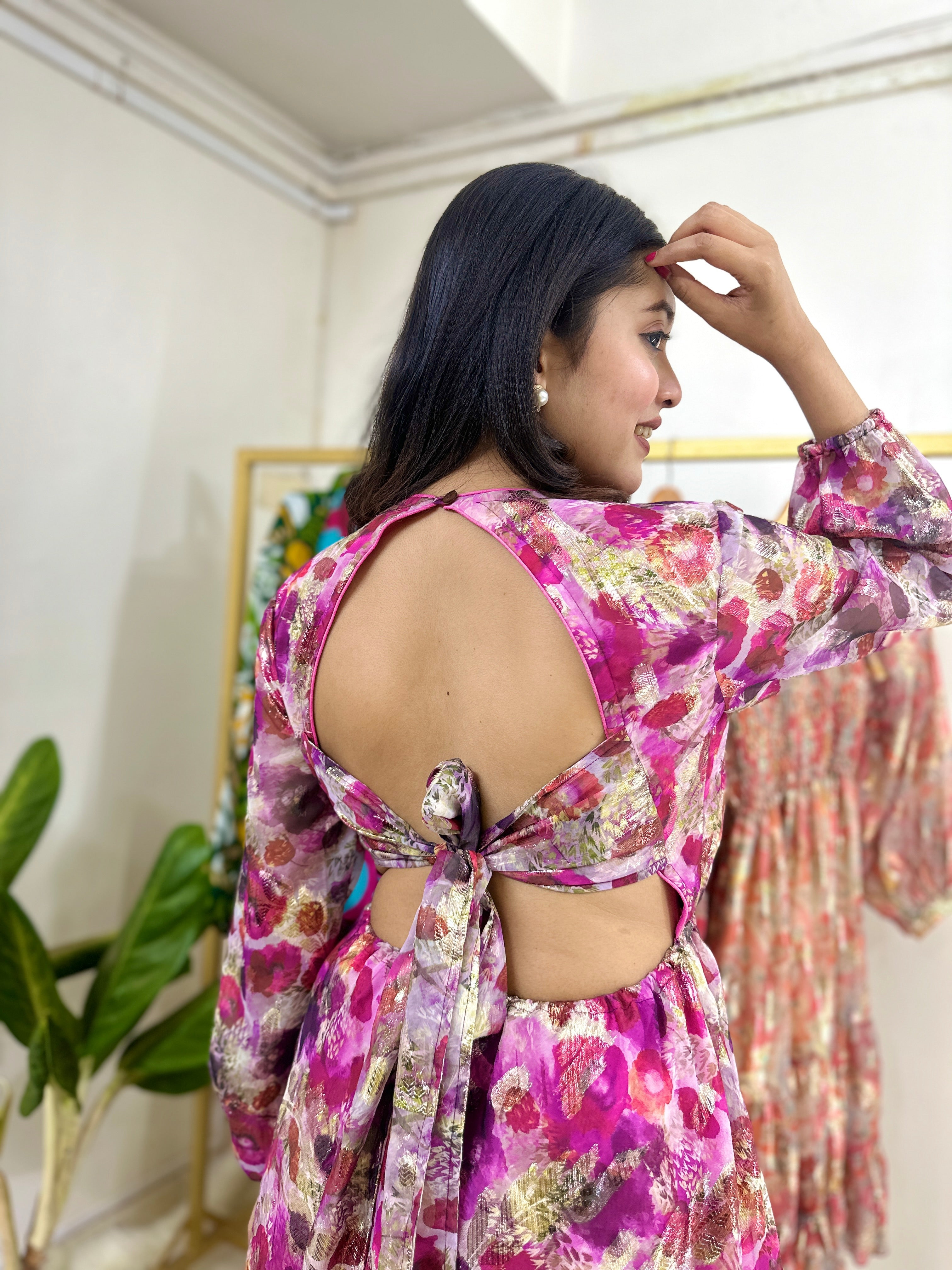This dress is perfect for those looking to make a statement with a blend of elegance and playful style. The combination of the floral print and the luxurious georgette jacquard fabric ensures a sophisticated yet approachable look.