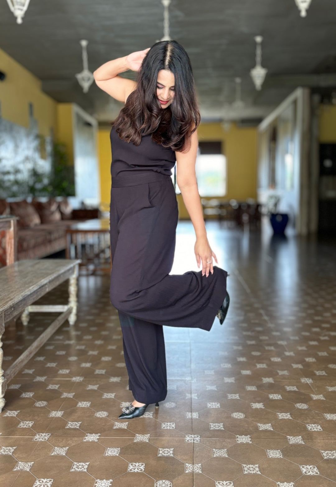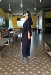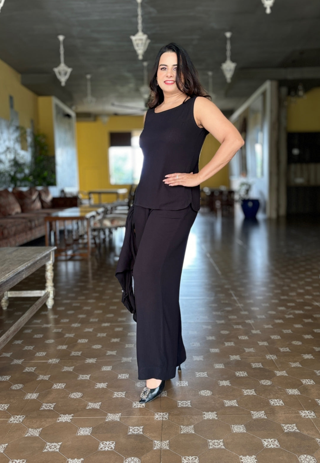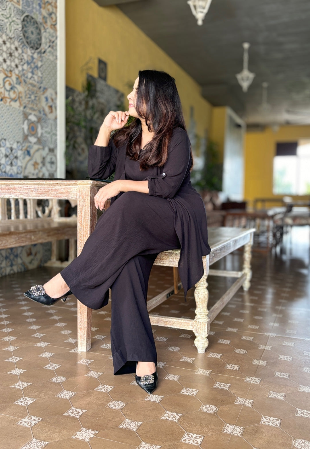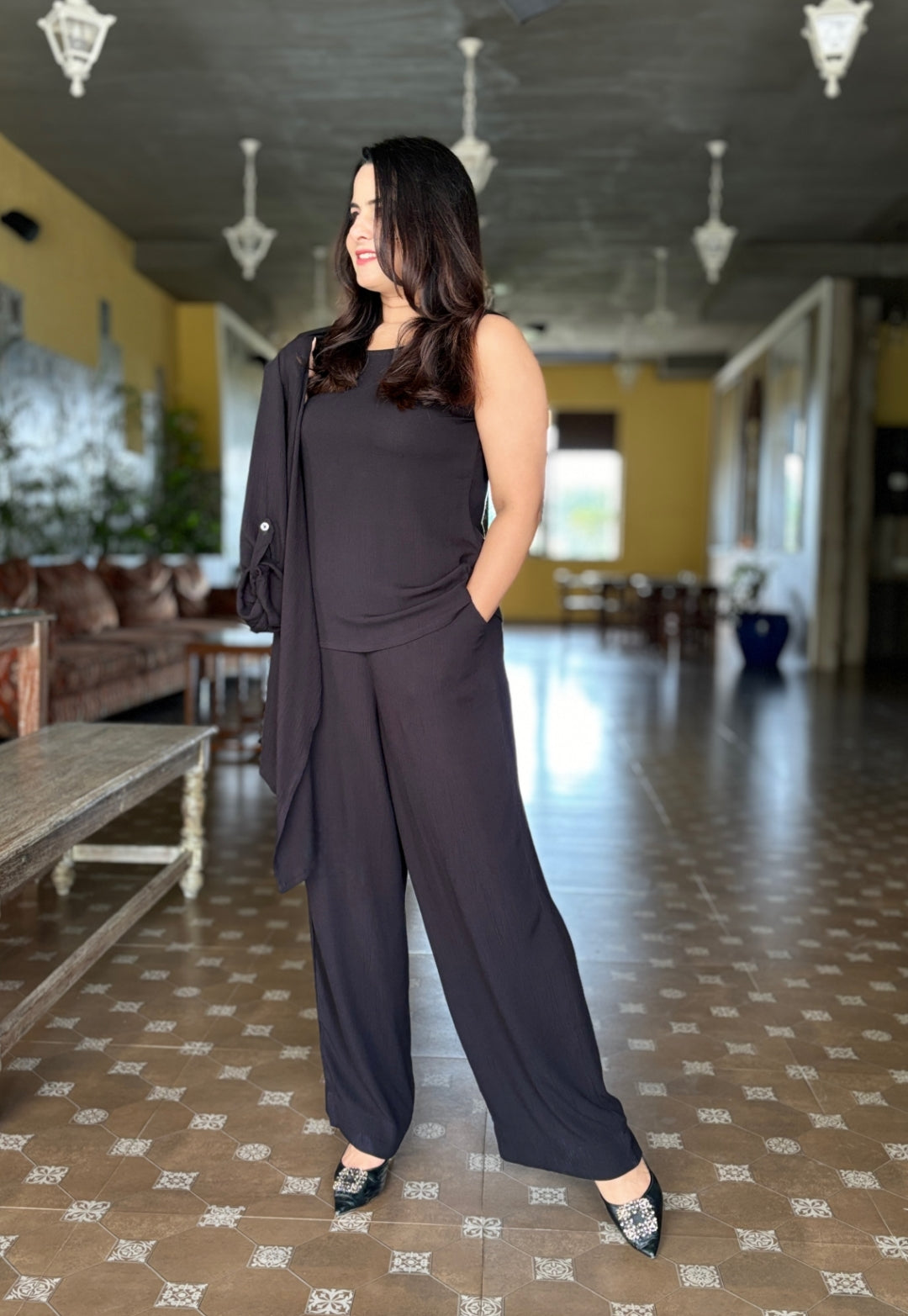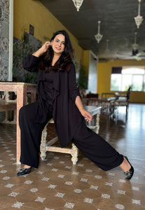 Classic, confident, and universally flattering—this black 3-piece co-ord set is a timeless wardrobe essential. Featuring a soft shrug, easy-fit top, and flowy bottoms, it’s crafted from breathable crush cotton and tailored to fit every body comfortably—including plus sizes.