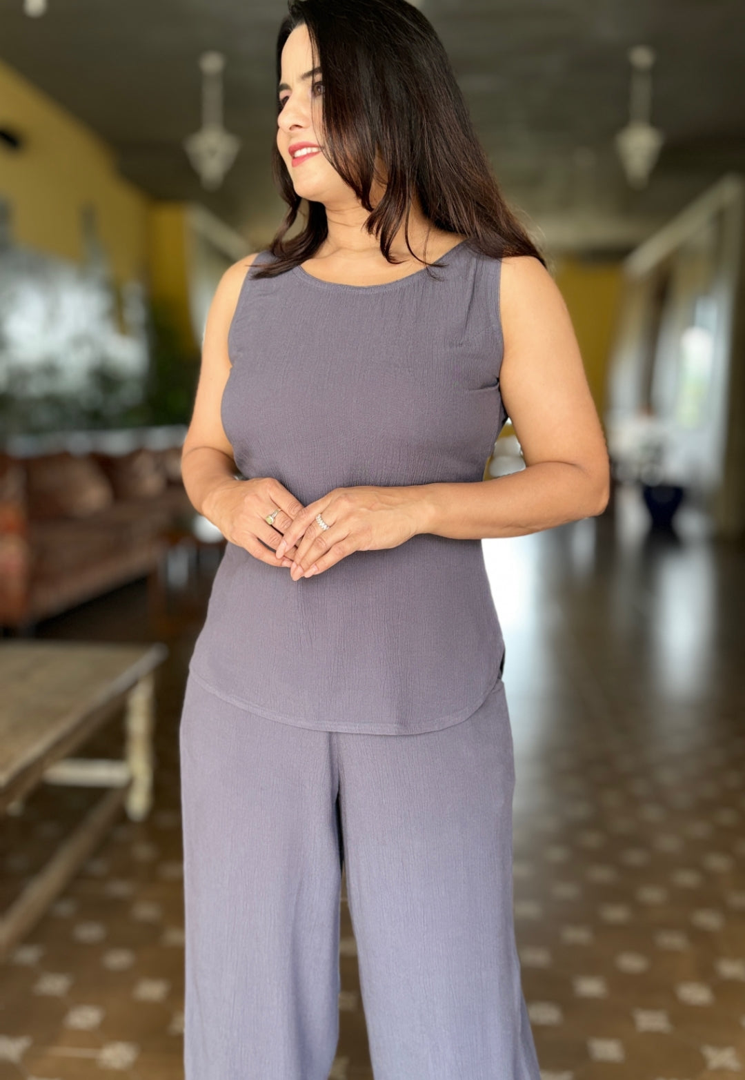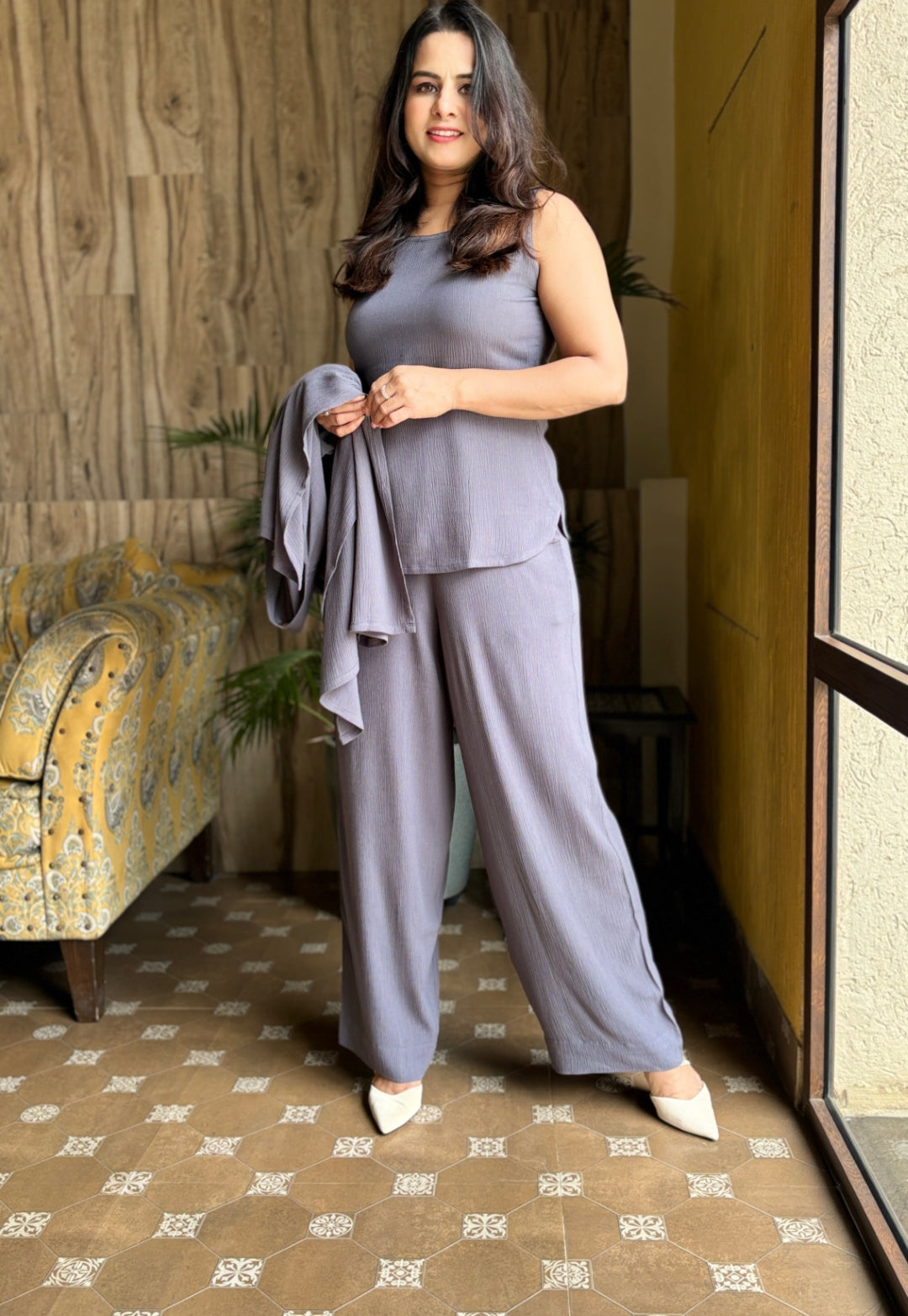 Understated and powerful, this dark grey 3-piece co-ord set blends minimalism with unmatched comfort. Featuring a flowing shrug, a relaxed-fit top, and breathable bottoms, it's crafted from soft crush cotton—tailored to flatter every body and designed for versatile, all-day wear.