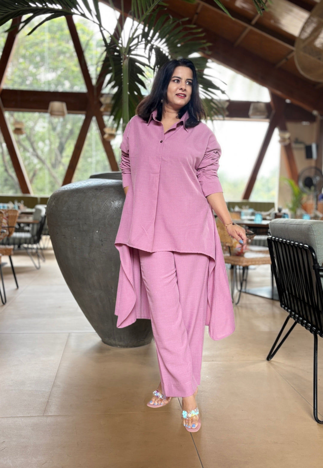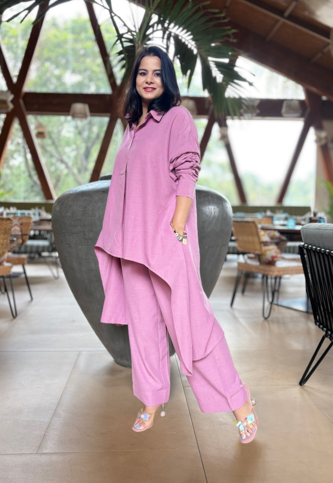 Step into subtle elegance with this onion pink asymmetric co-ord set.