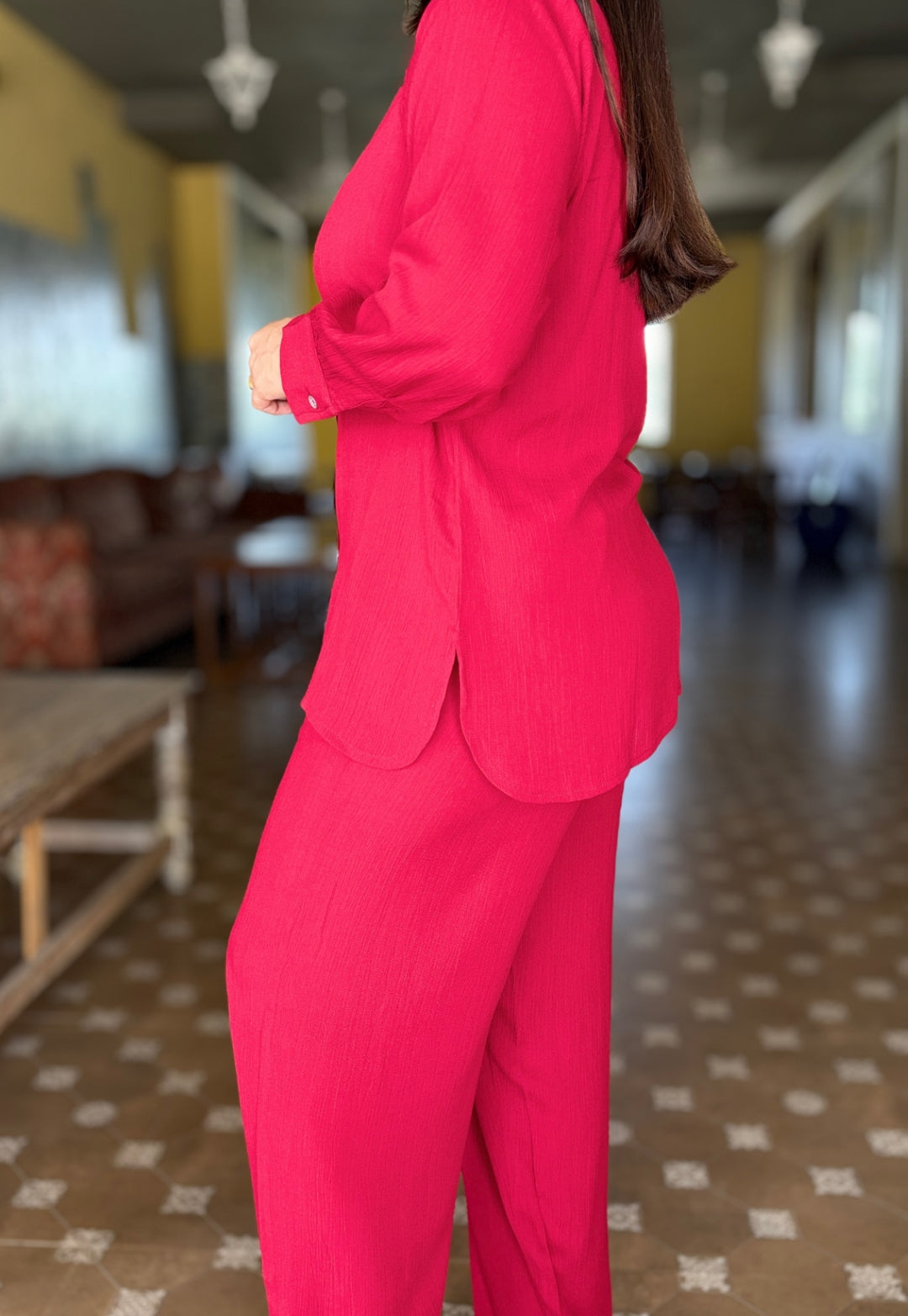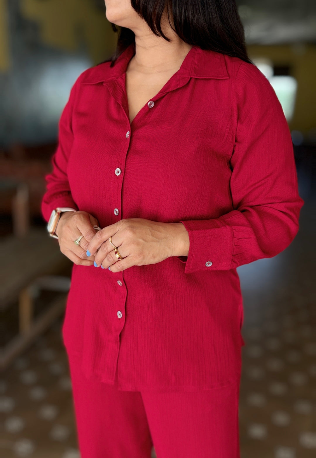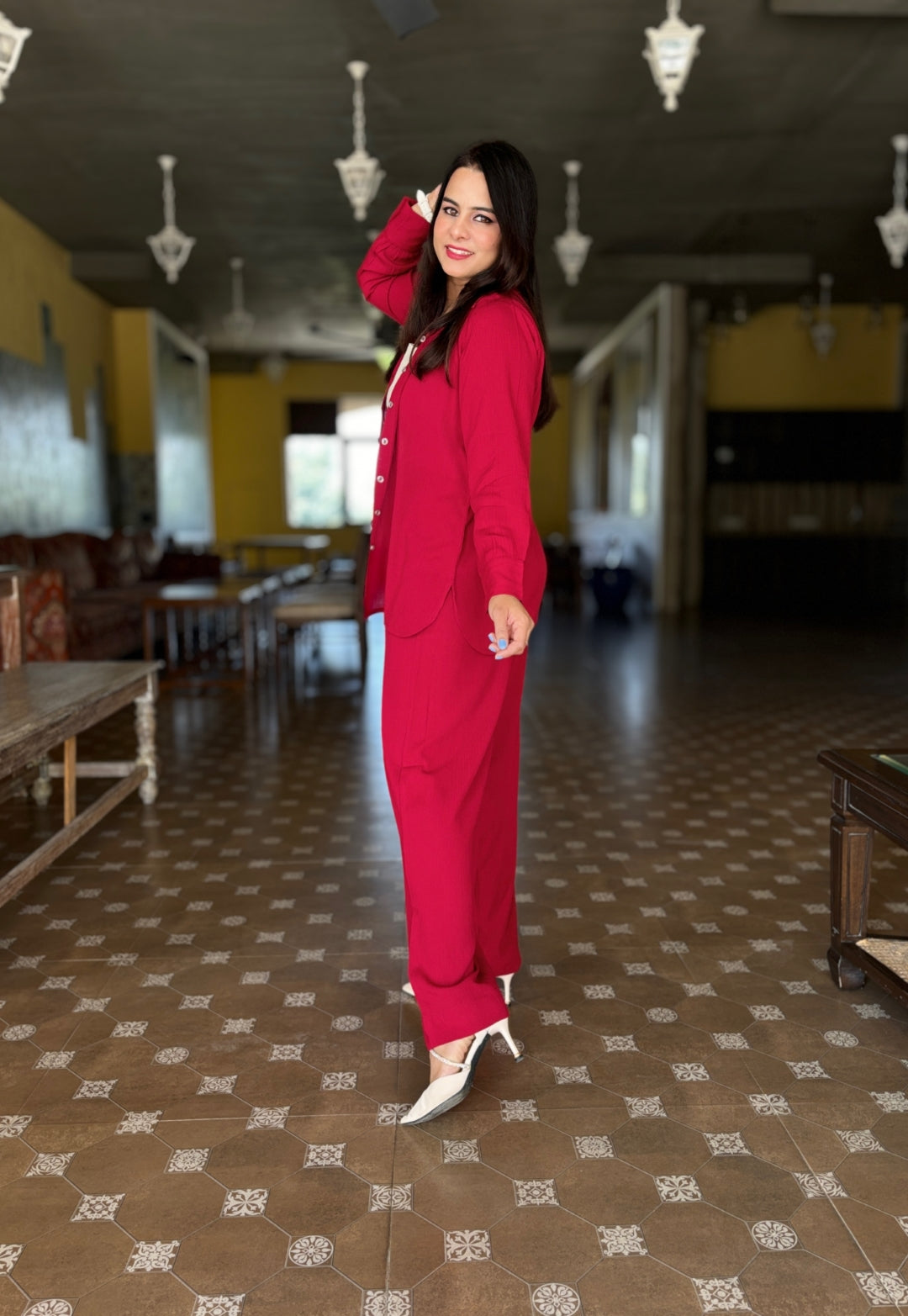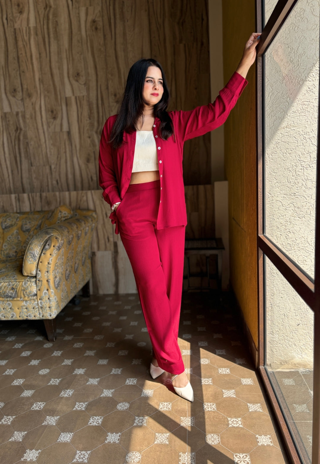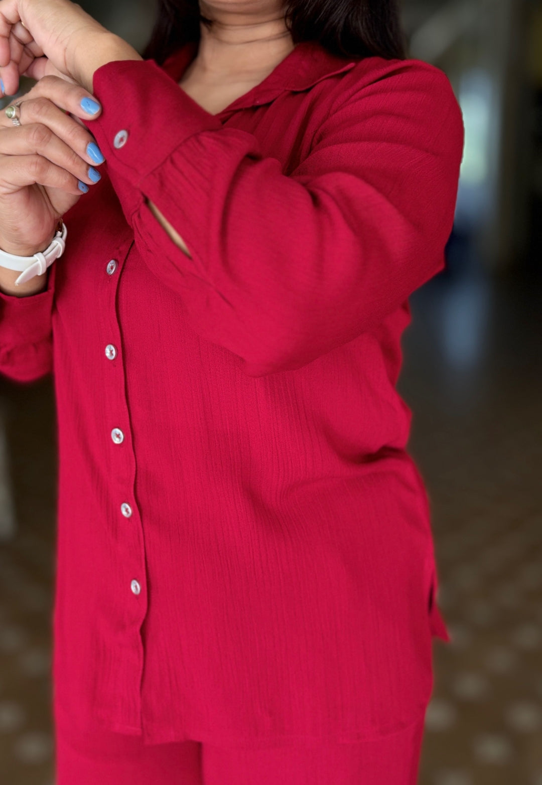Turn heads effortlessly with the Solid Cherry Red Cord Set, a bold and stylish ensemble designed for ultimate comfort. Featuring a loose-fit top and crafted from soft, crush-textured cotton, this set blends vibrant charm with relaxed sophistication.