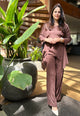 Grounded in warmth and rich in versatility, this dark brown 3-piece co-ord set is designed to deliver comfort, coverage, and effortless elegance. Featuring a breezy shrug, a relaxed-fit top, and flowy bottoms, it's crafted from breathable crush cotton—perfect for everyday wear or dressed-up outings.