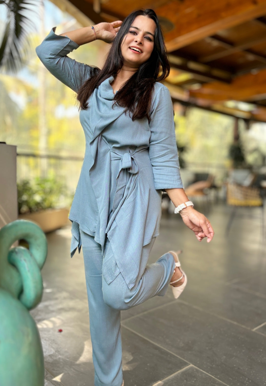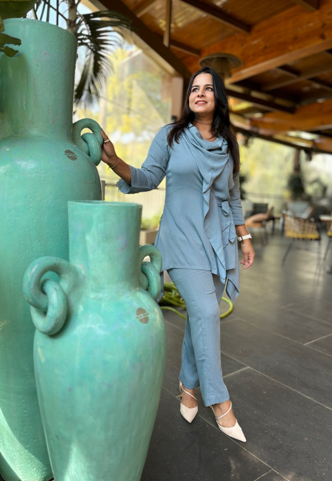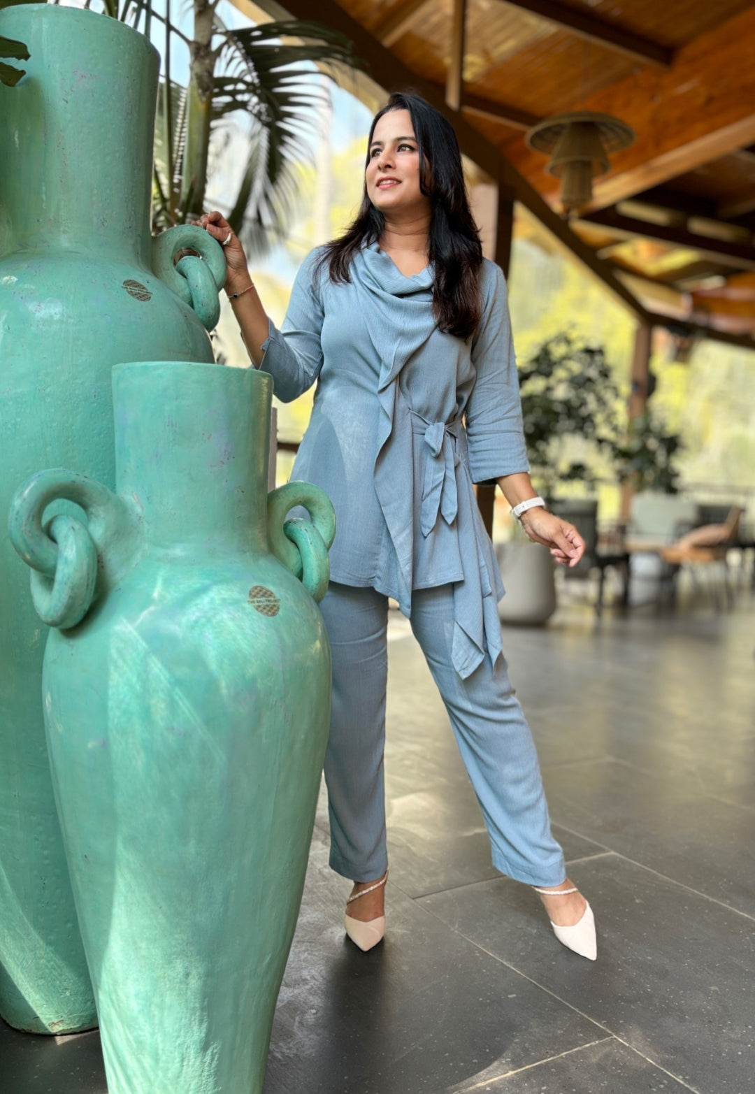 Soft, subtle, and effortlessly elegant—this light grey trail-cut cord set pairs modern design with everyday comfort. Featuring a sculpted cowl neckline and a flattering trail-cut hem, it’s tailored from breathable crush cotton and made to complement all body types, including plus size.
