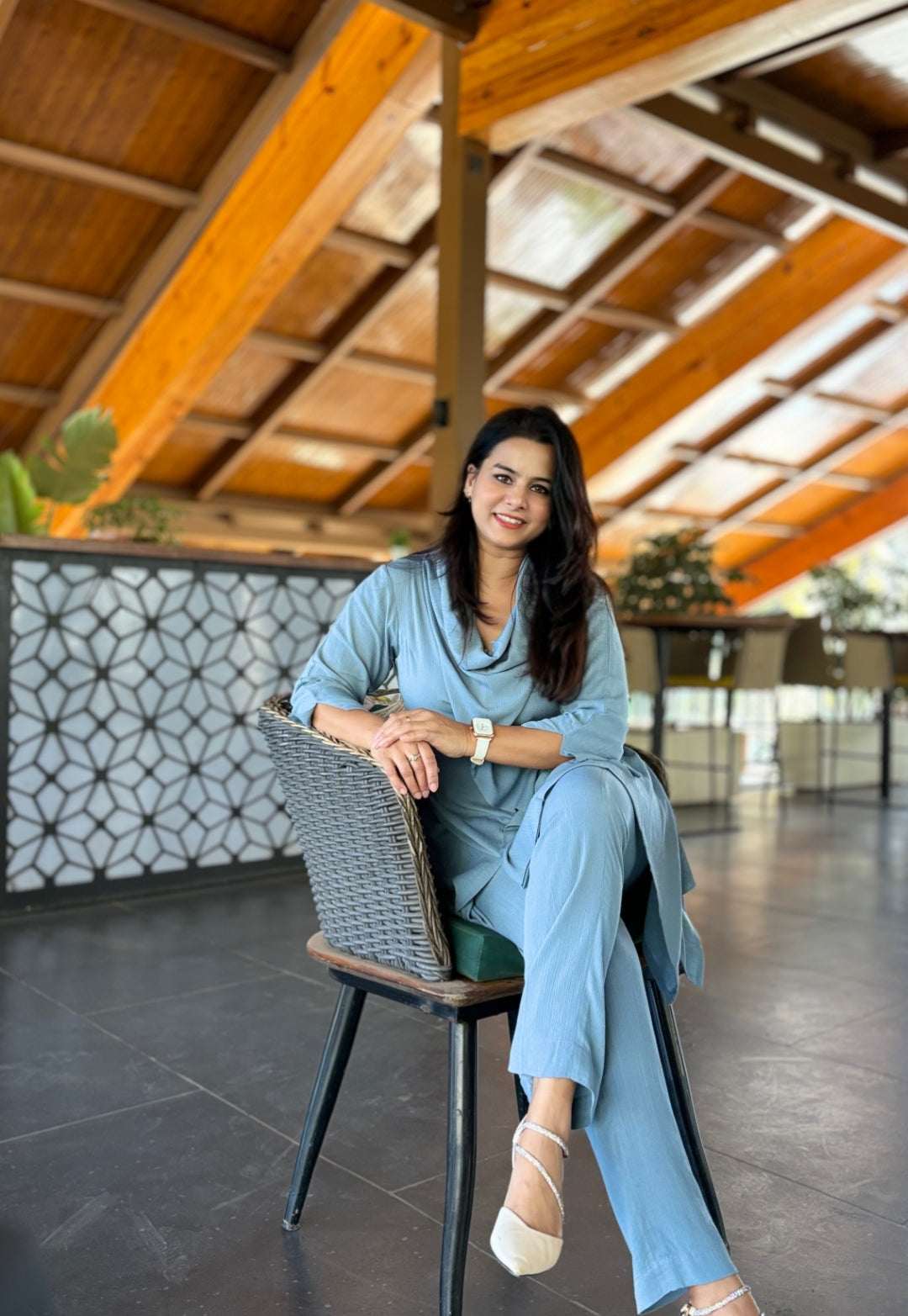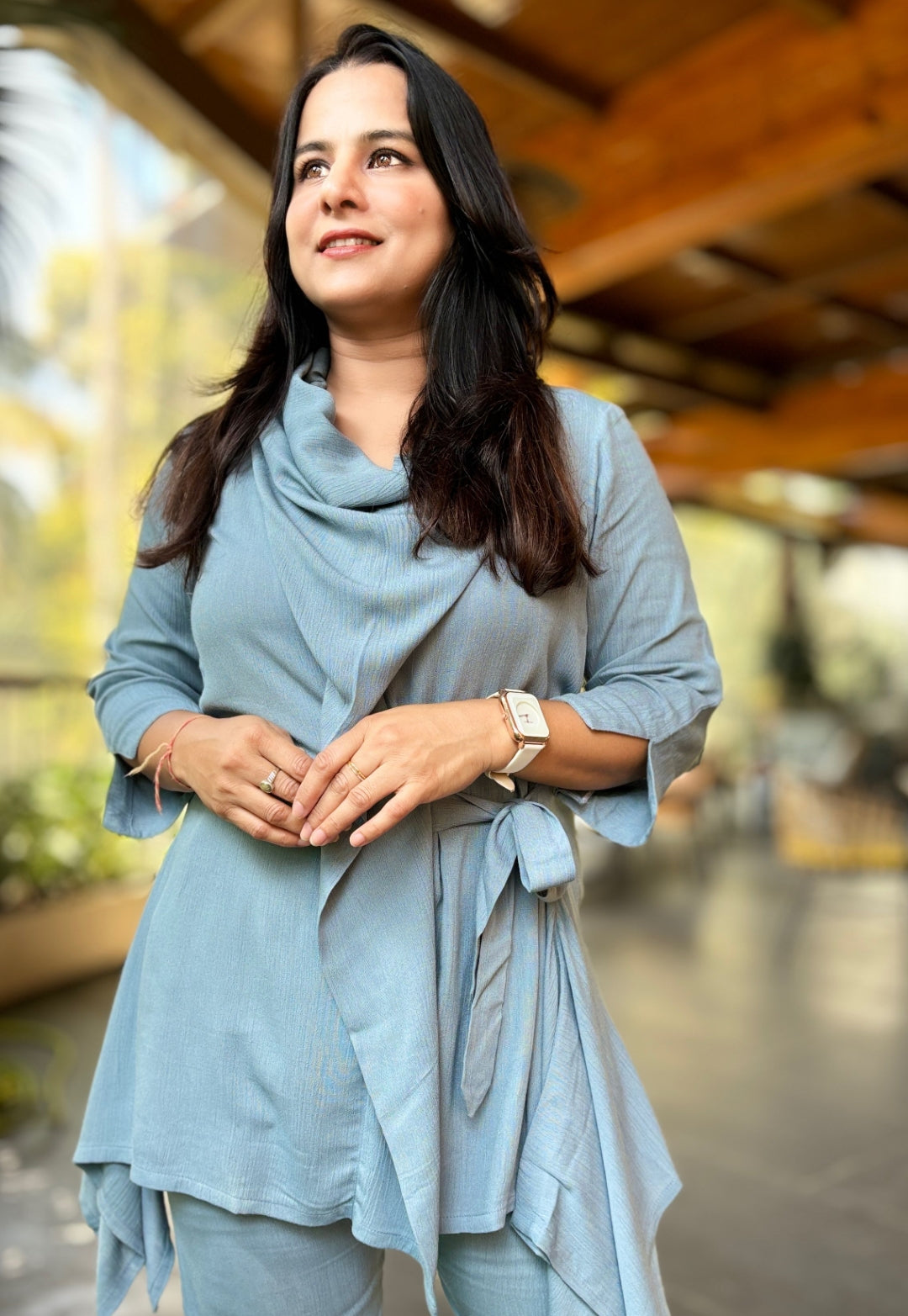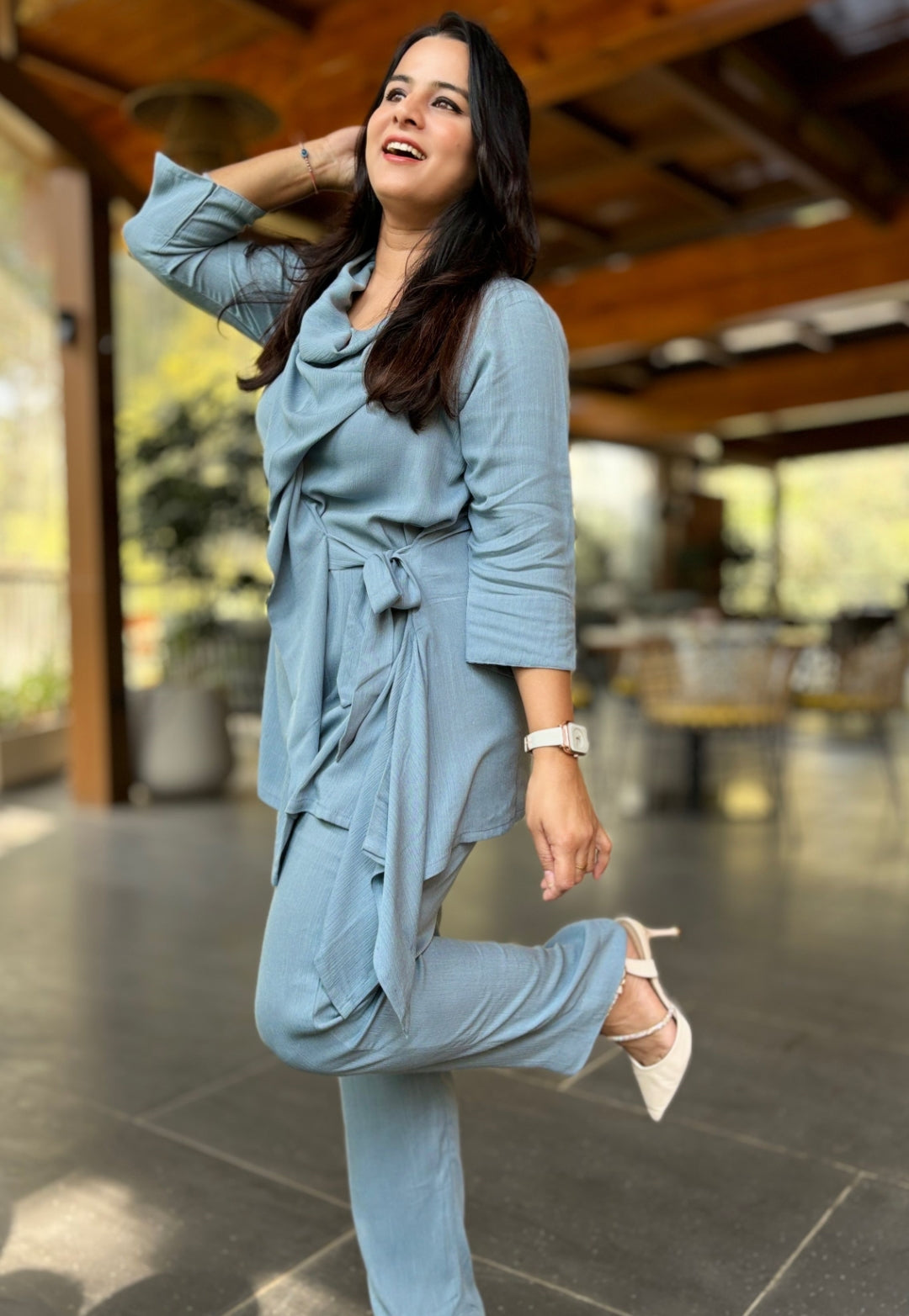 Soft, subtle, and effortlessly elegant—this light grey trail-cut cord set pairs modern design with everyday comfort. Featuring a sculpted cowl neckline and a flattering trail-cut hem, it’s tailored from breathable crush cotton and made to complement all body types, including plus size.