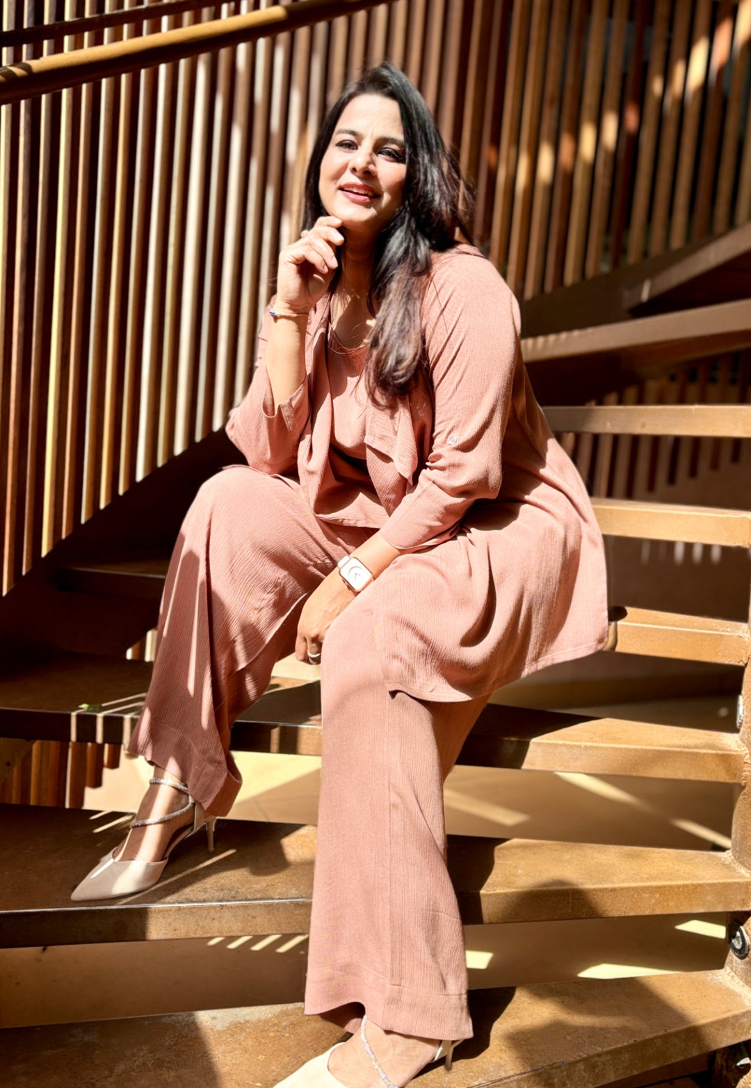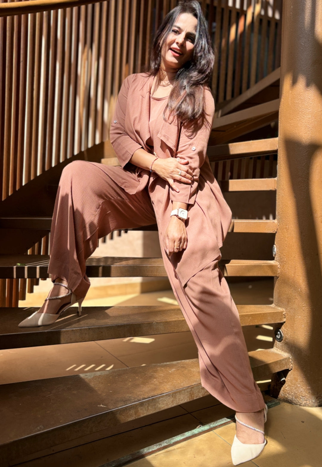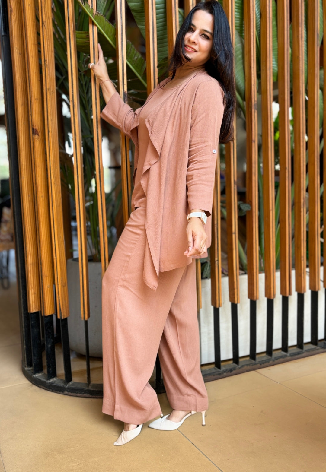 Refined and rooted in warmth—this light brown 3-piece co-ord set offers effortless sophistication with maximum comfort. Made from breathable crush cotton, it includes a sleek top, relaxed trousers, and a soft-flow shrug. Ideal for everyday elegance and easy layering.