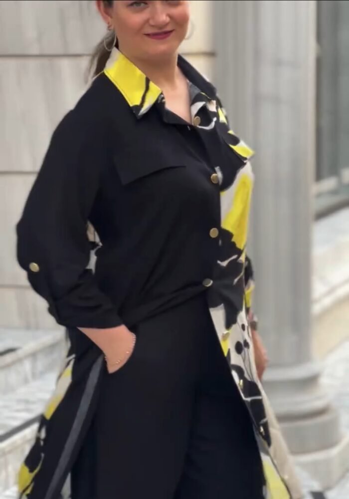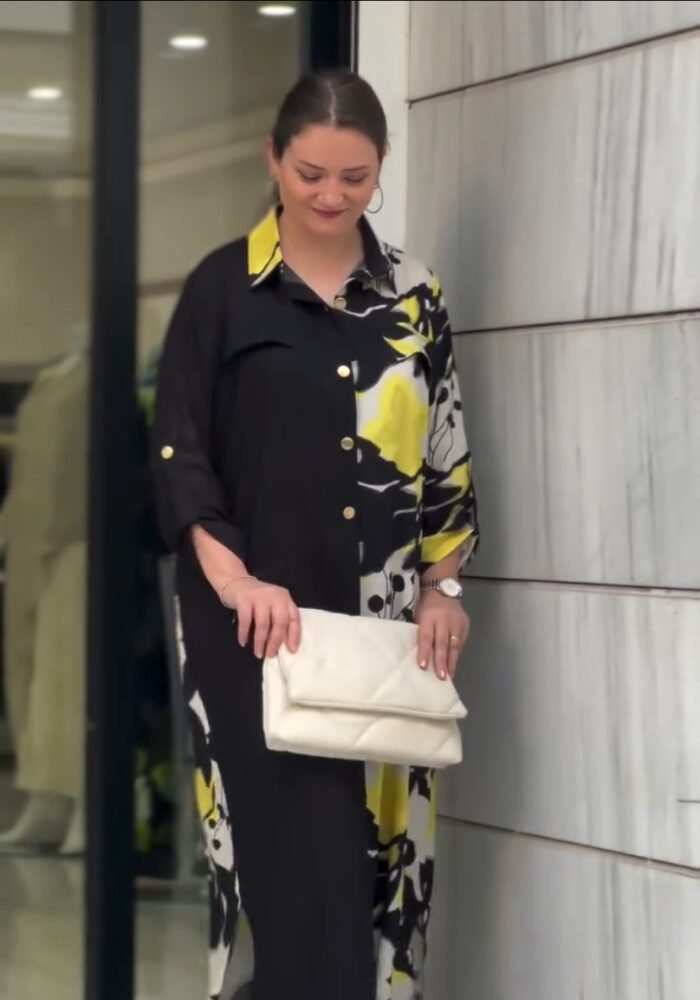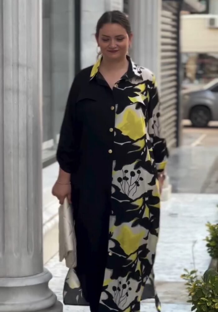 Turn heads in our Half & Half Abstract Shirt Dress – where timeless black meets playful yellow floral strokes.