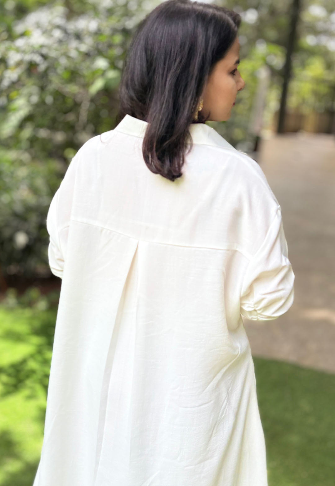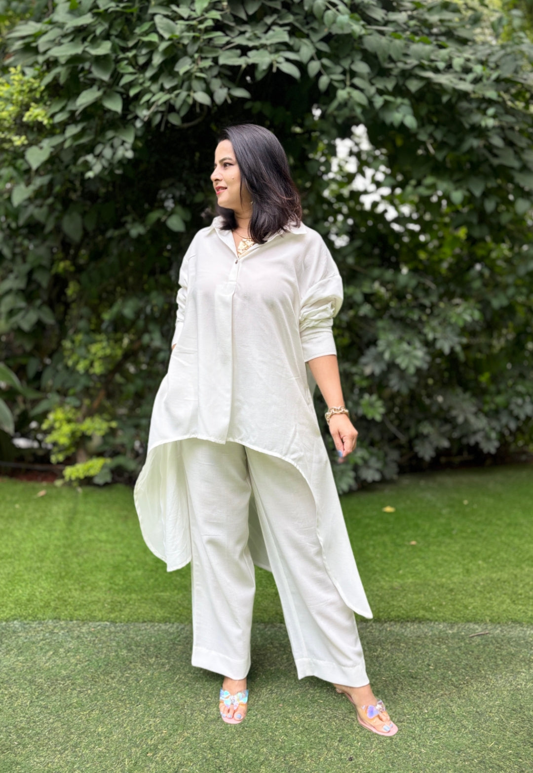 This white asymmetric co-ord set is a wardrobe essential for lovers of elevated basics. The draped hem top and versatile pants offer a refined take on comfort.