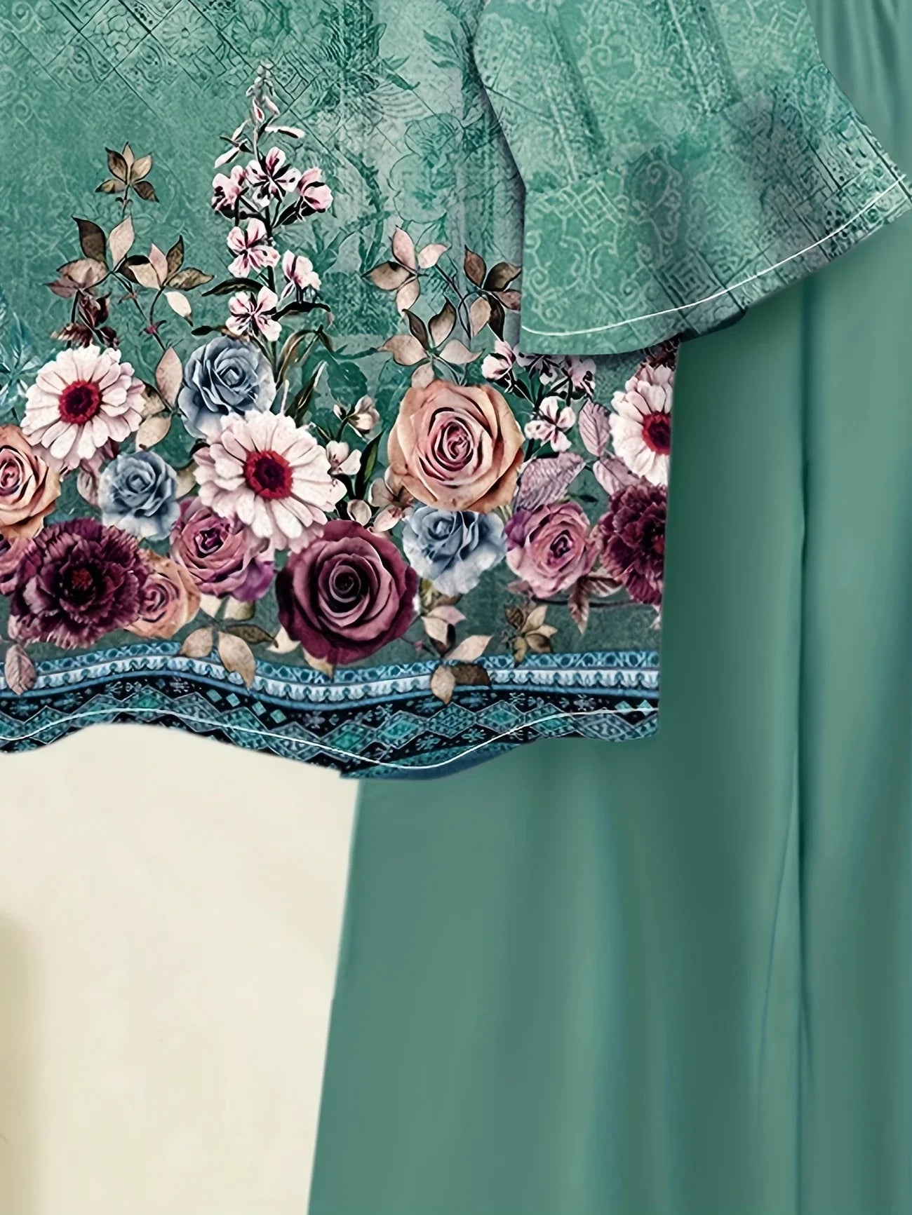 🌸 Floral Print Top – Soft short sleeves, round neck, and a refreshing green palette