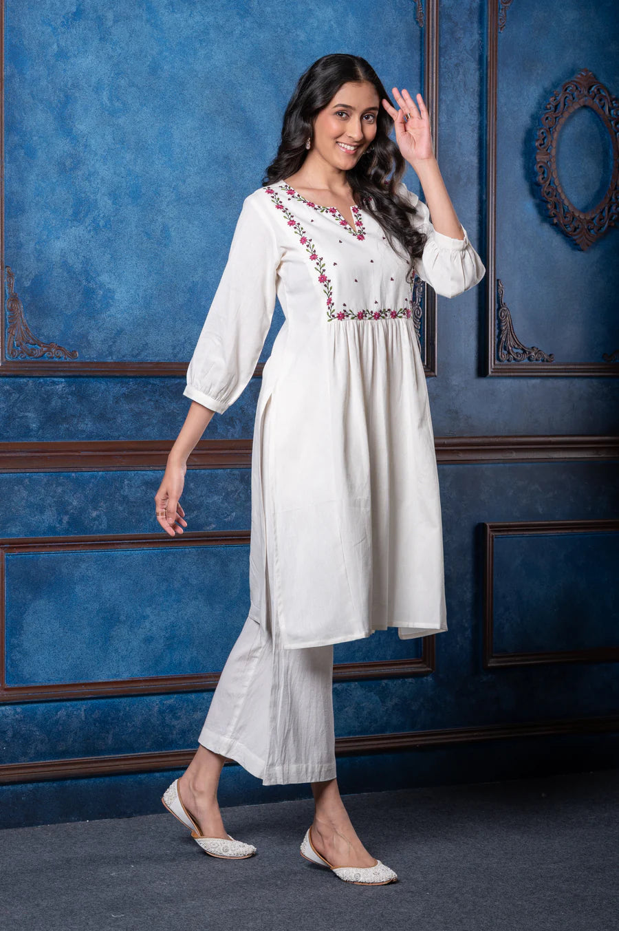 The hand-embroidered kurta showcases delicate and rich thread embroidery with intricate bead embellishments, reflecting the timeless beauty of Kashmiri craftsmanship. Adding a functional edge, the kurta is designed with pockets, combining elegance with everyday convenience. Its regular fit and round neckline provide a flattering silhouette that seamlessly blends tradition with contemporary style.