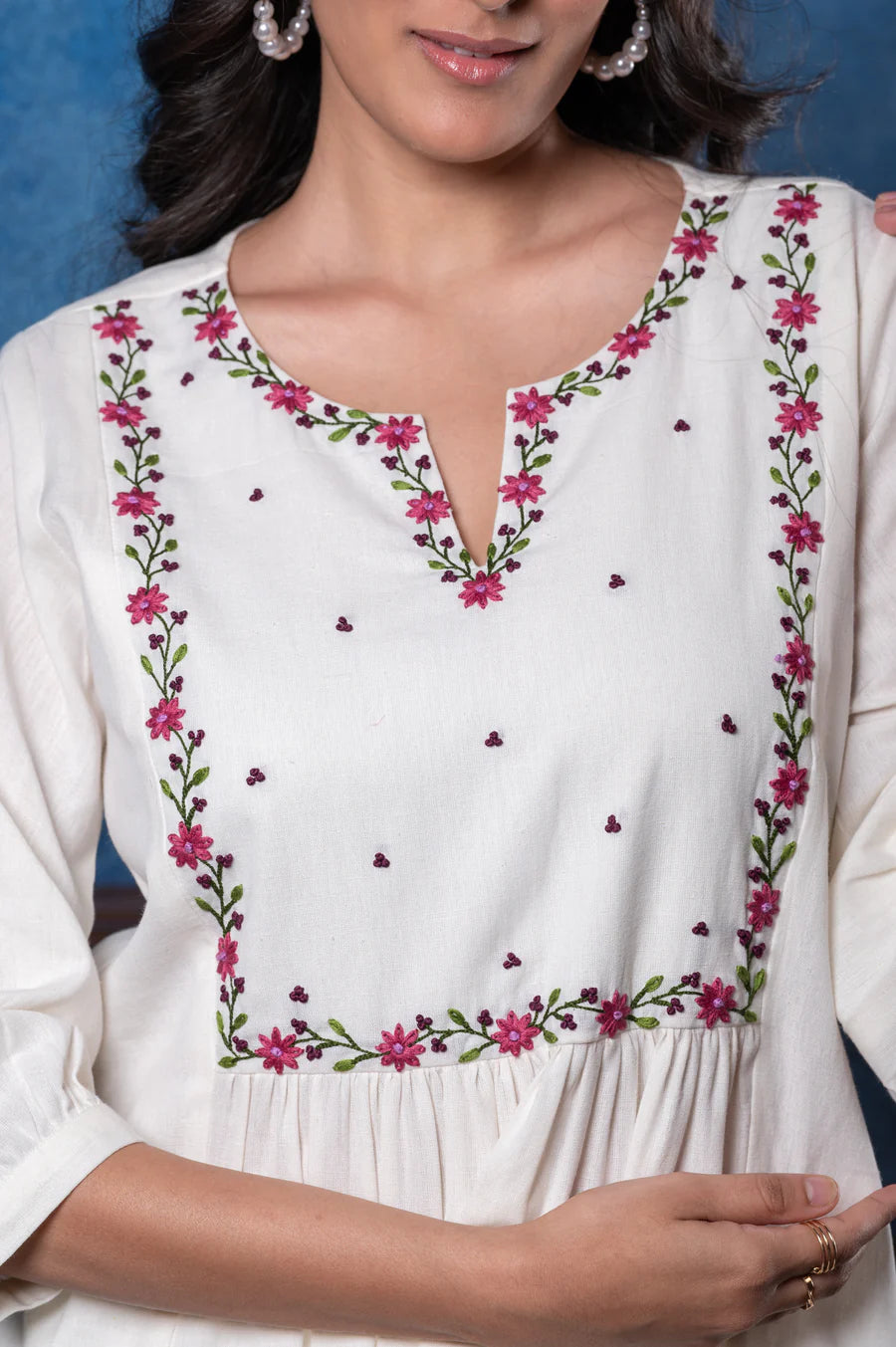Elevate your everyday ethnic wear with this Women’s Cotton Flex Round Neck Kashmiri Hand-Embroidered Regular Fit Kurta, a perfect fusion of traditional artistry and modern practicality. Crafted from comfortable cotton flex fabric, this kurta ensures breathability and ease of wear, making it ideal for all-day comfort.
