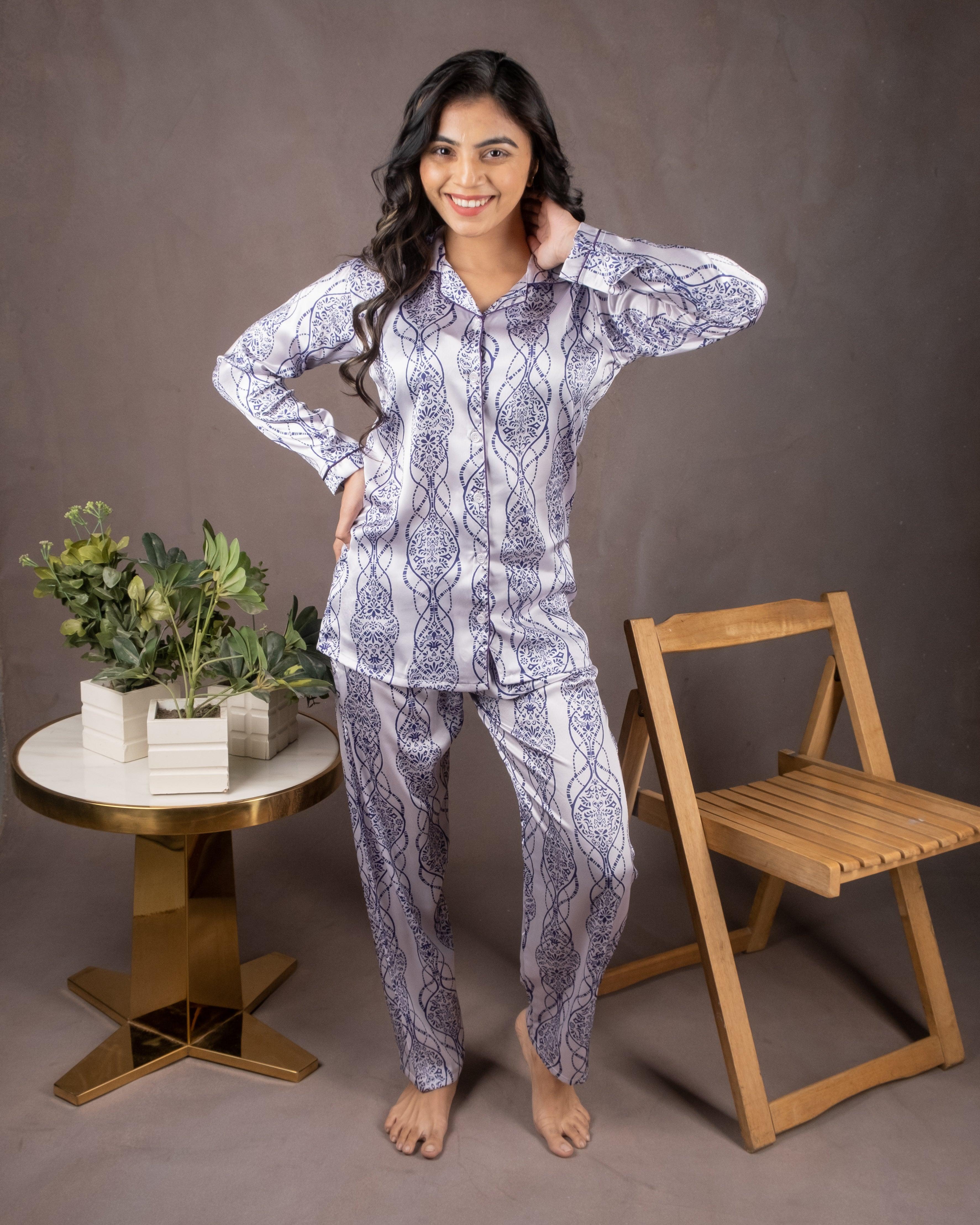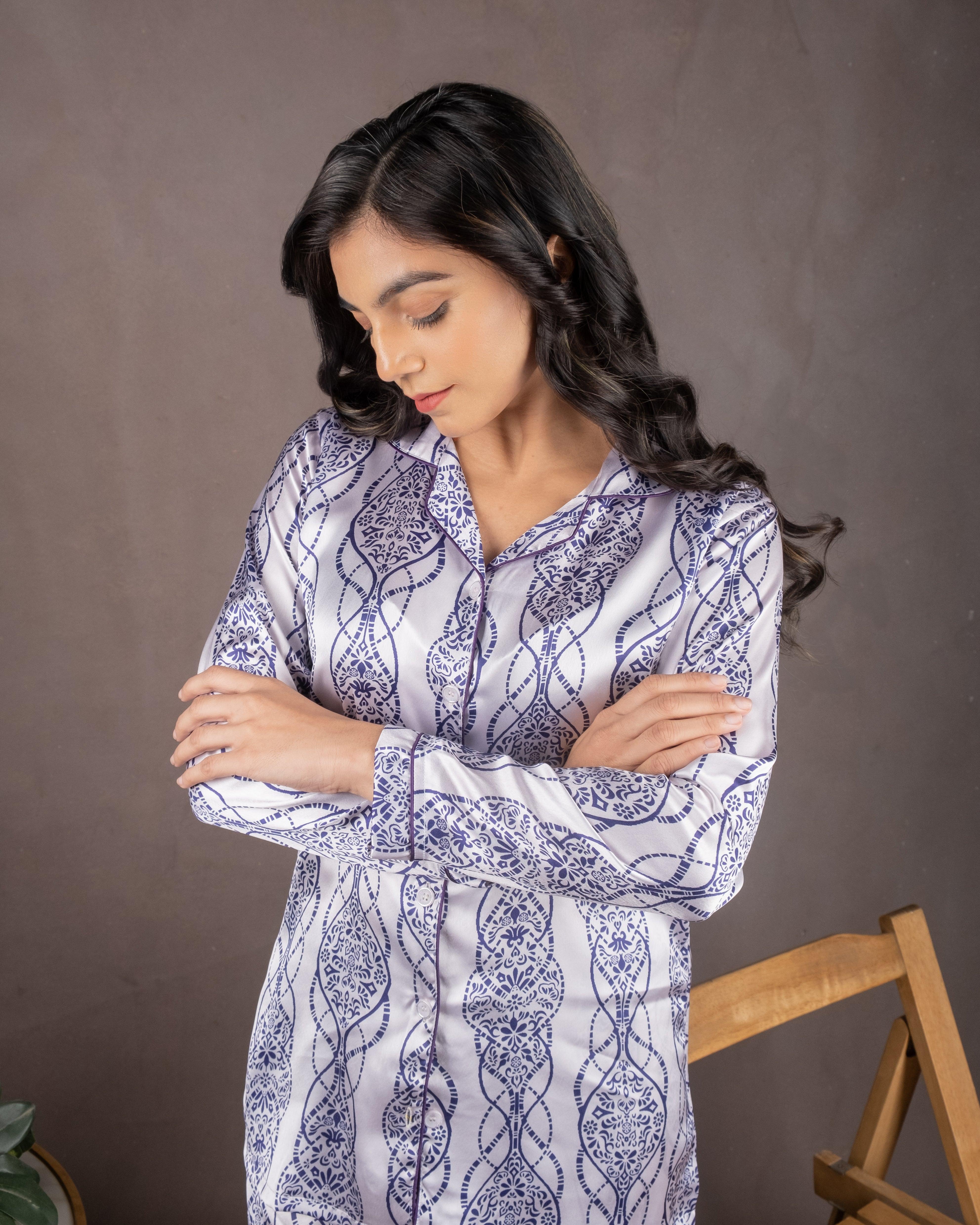 " Eternal Bliss Collection" with the Blissful Blue Artistry Ensemble. The captivating pattern showcases romantic tile-like patterns, a decorative plate print, and intricate mosaics, complemented by beloved, mood-boosting florals. Crafted from silky smooth digitally printed satin, this night suit offers a luxurious feel, ideal for year-round lounging and a perfect night suit for any season.
