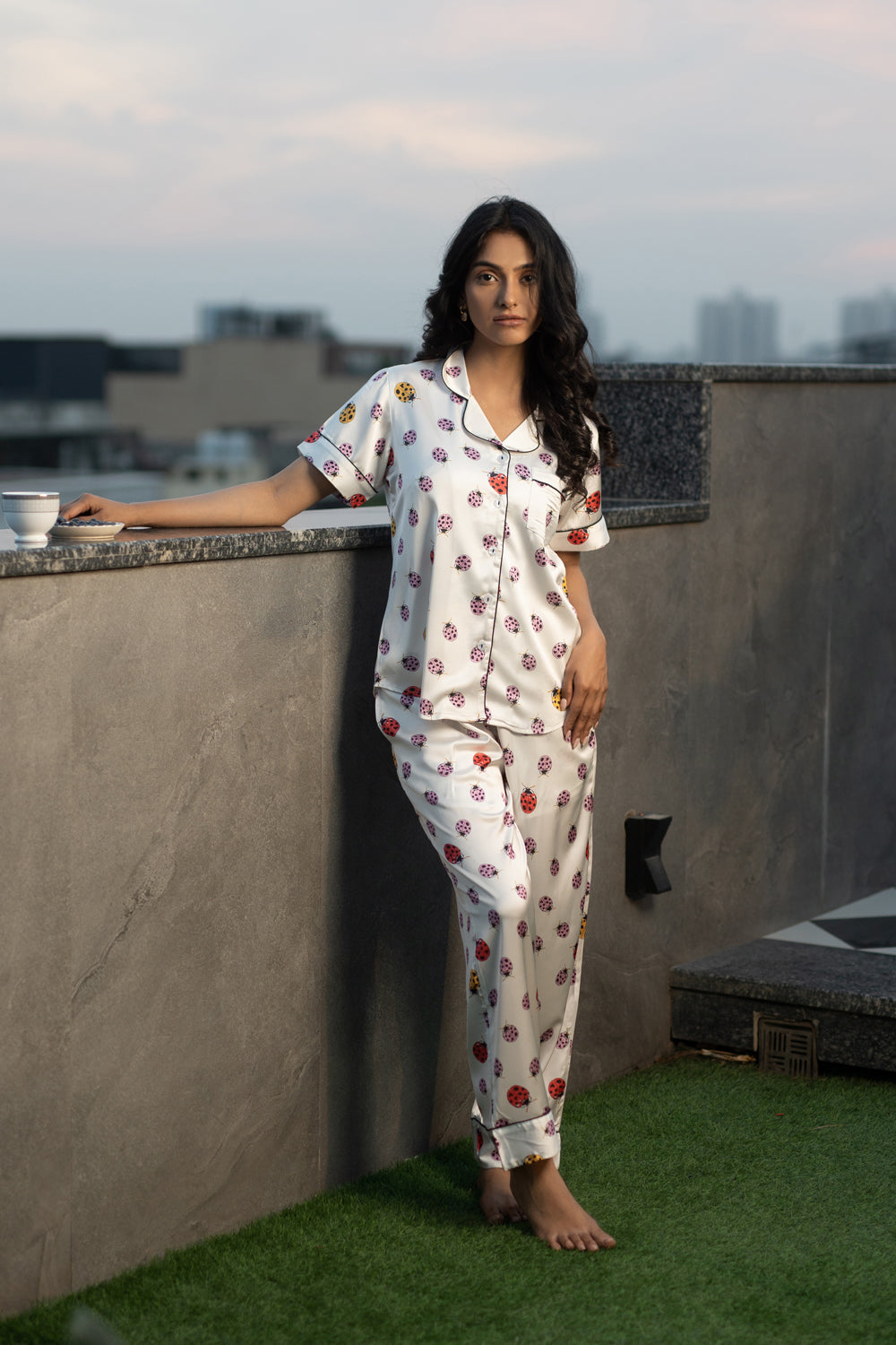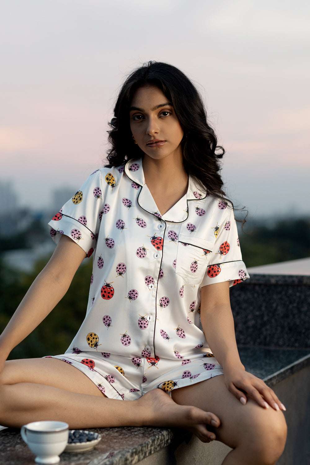 Elevate your loungewear with this Classic Collar Shorts & pajama Set, crafted from super-soft Lady-bug print satin. The set features a stylish classic collar, offering a refined yet relaxed look, while the satin fabric adds a luxurious feel against the skin. The soft, breathable material ensures comfort throughout the day, whether you're lounging at home or enjoying a casual outing. The vibrant print gives a modern twist to this timeless design, making it a must-have for your wardrobe.