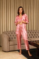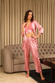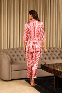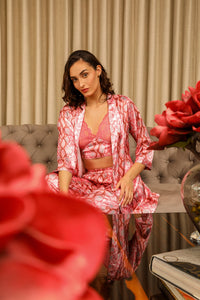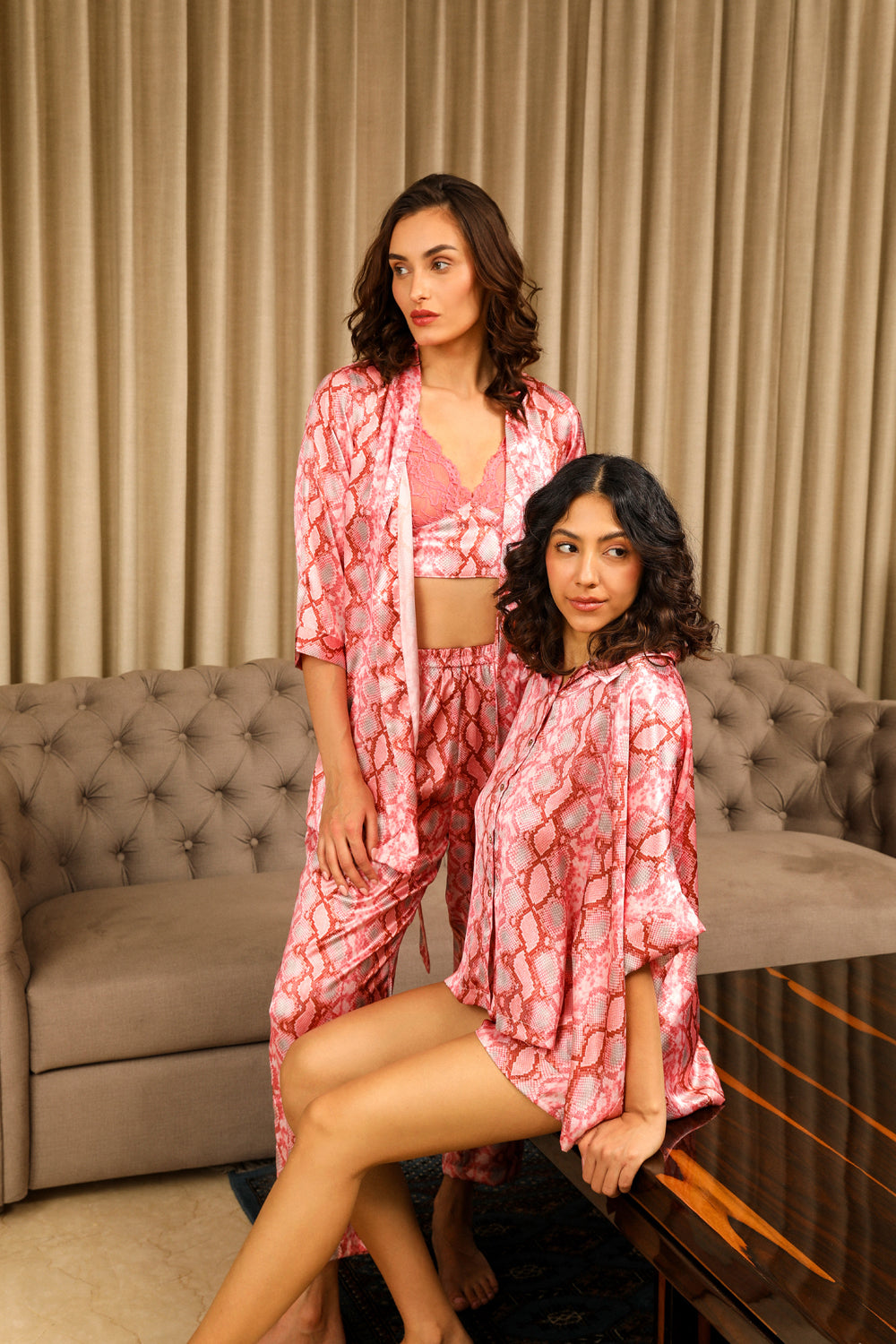 Unleash your wild side with our Leopard Print Bralet, Pajama, and Robe Set in satin. This luxurious ensemble includes a stylish bralet, comfortable pajama bottoms, and a flowing robe, all adorned with a bold leopard print. Crafted from silky satin, each piece offers a smooth, glamorous feel against your skin. Perfect for making a statement at home, this set combines fierce fashion with ultimate comfort. Elevate your loungewear collection with this stunning leopard print trio.