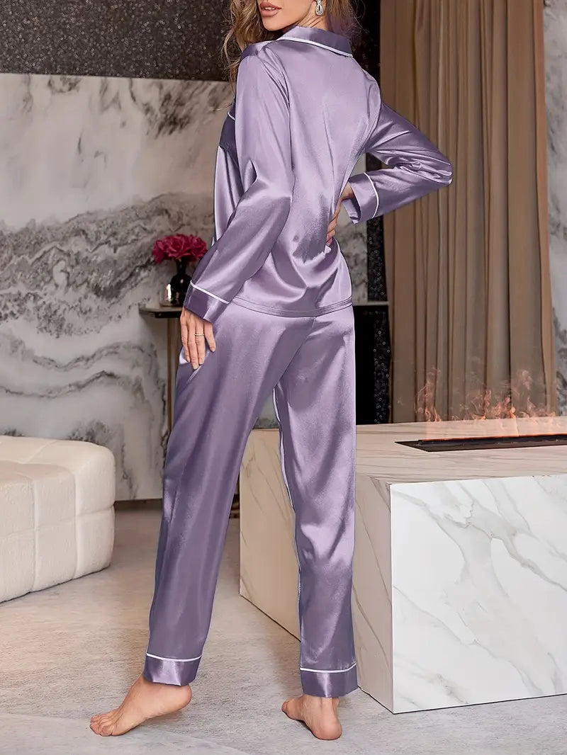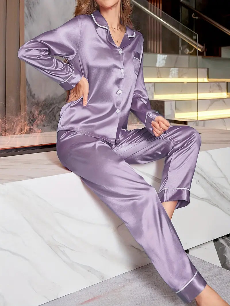 Wrap yourself in the serene elegance of our Luxe Lounge Dreams Co-ord Set – Lavender Glow. Crafted from buttery-soft satin in a delicate light purple shade, this refined loungewear set features a classic button-down shirt with a notched collar, chest pocket, and subtle white contrast piping. The matching pants offer a relaxed fit with a gentle elastic waistband, ensuring all-day comfort with a touch of sophistication. Perfect for tranquil evenings, bridal prep moments, or thoughtful gifting—this set elevates your loungewear with a soothing splash of lavender luxury.