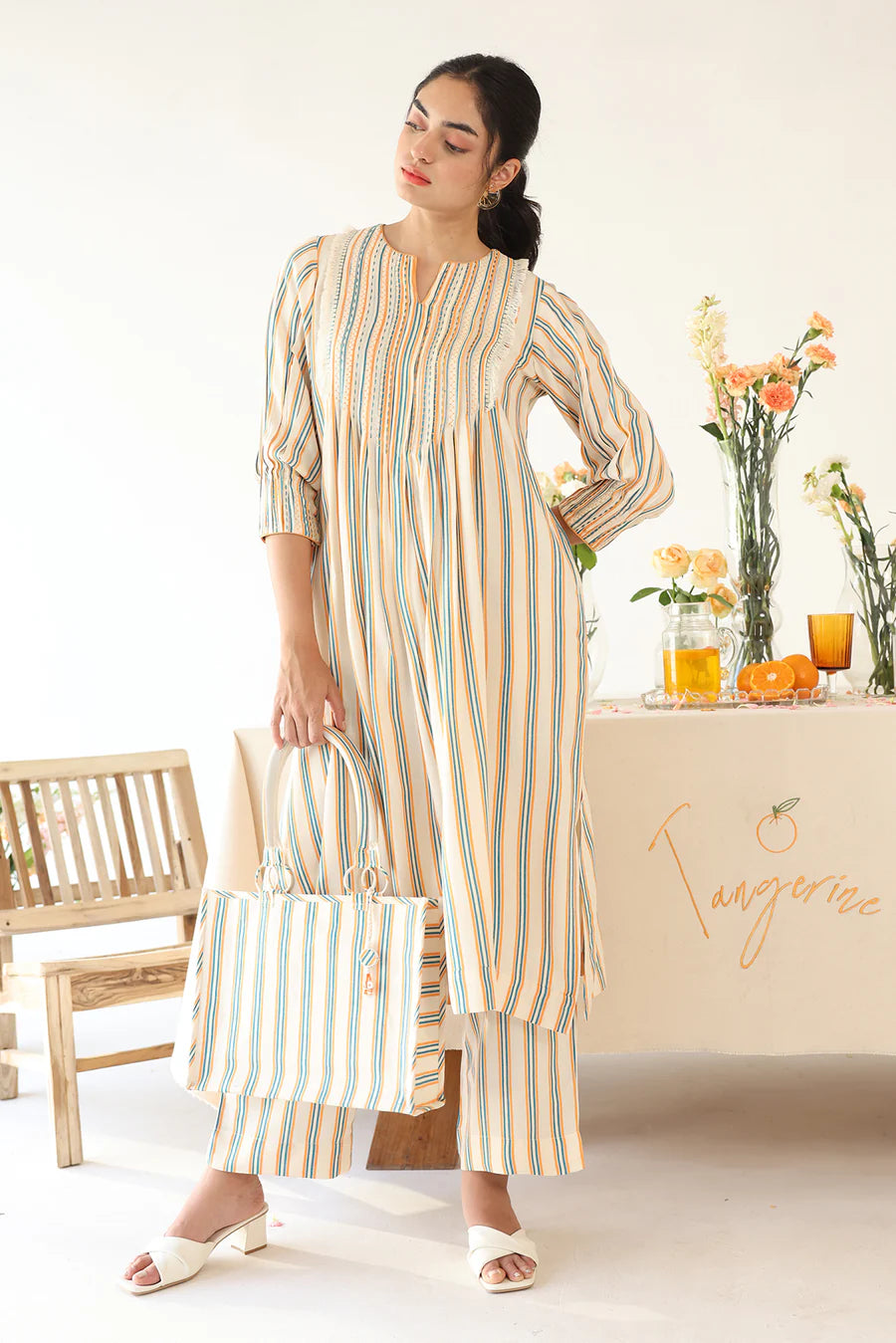 Sepia is a relaxed fit kurta with stripe print, featuring pleat detail on the front and sleeve cuffs. Embellished with green and orange silk thread embroidery, accented by orange piping on the neck and sleeves.