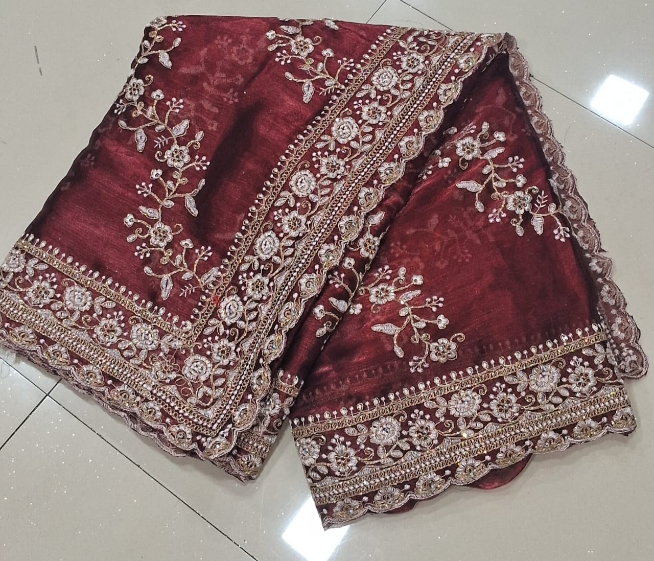 Maroon Diamond Hand Work Party Wear Launching Designer saree jimmy Choo Fabric With Glitter Dori Embroidery work
