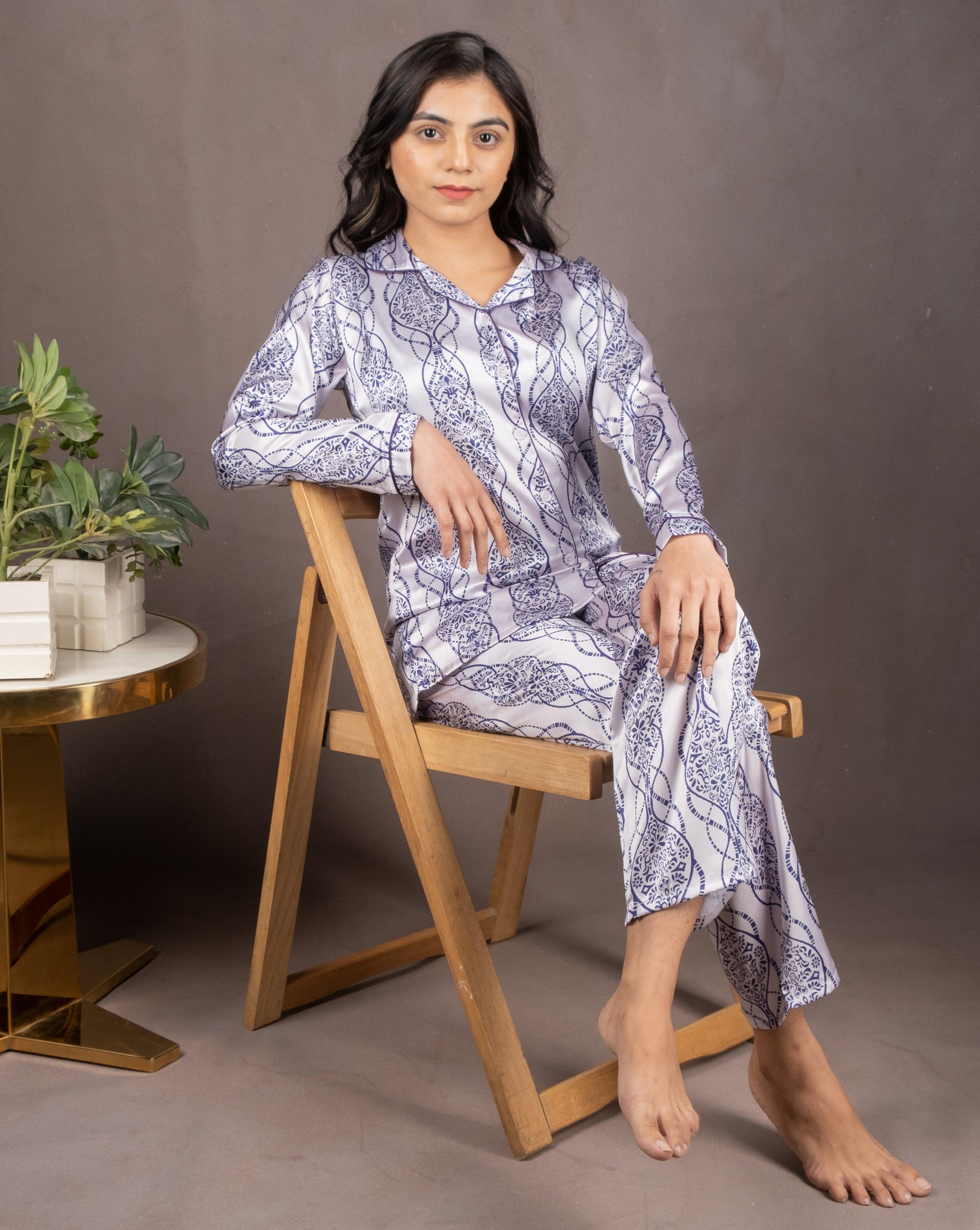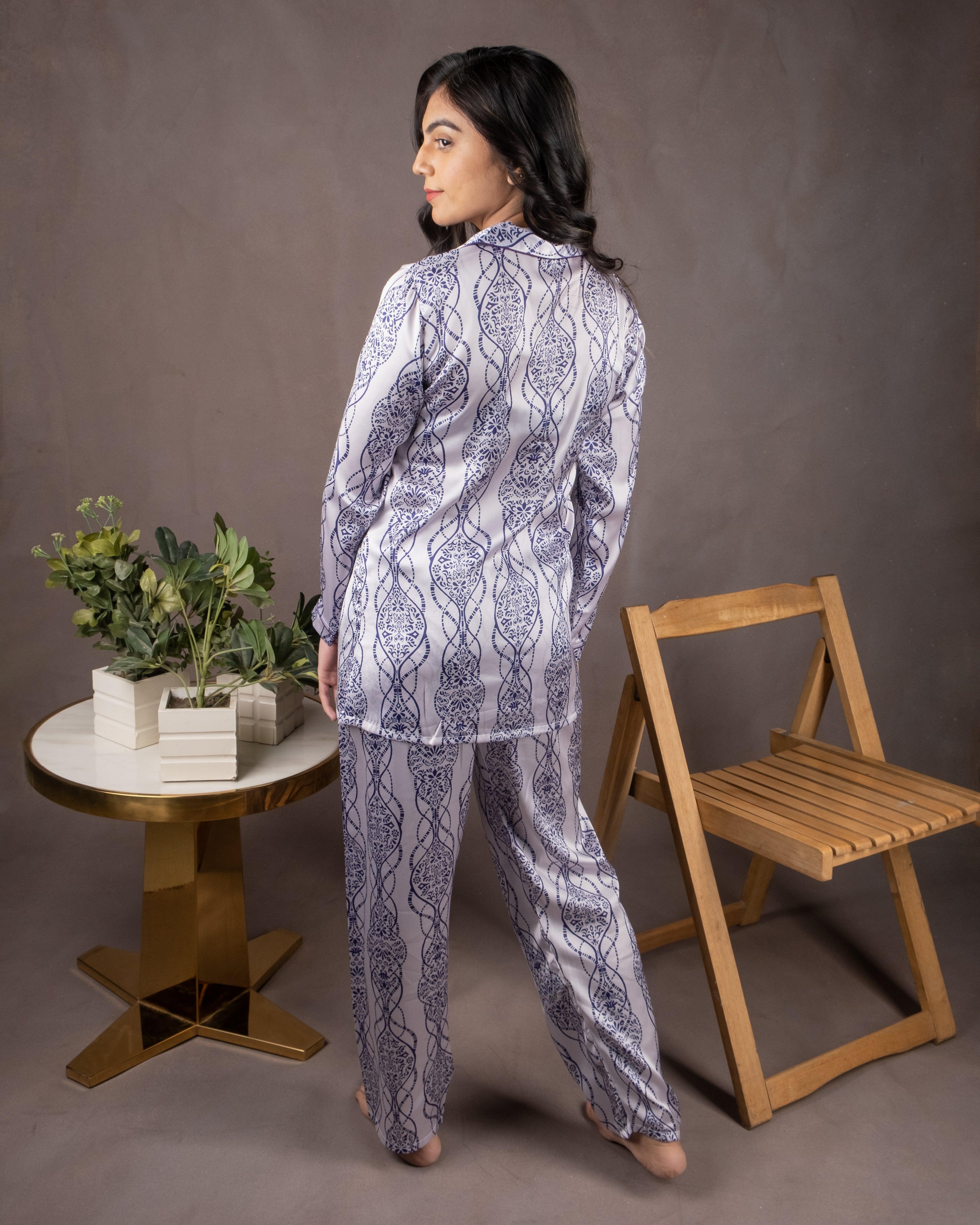 Jynara gracefully unveils the allure of our " Eternal Bliss Collection" with the Blissful Blue Artistry Ensemble. The captivating pattern showcases romantic tile-like patterns, a decorative plate print, and intricate mosaics, complemented by beloved, mood-boosting florals. Crafted from silky smooth digitally printed satin, this night suit offers a luxurious feel, ideal for year-round lounging and a perfect night suit for any season.