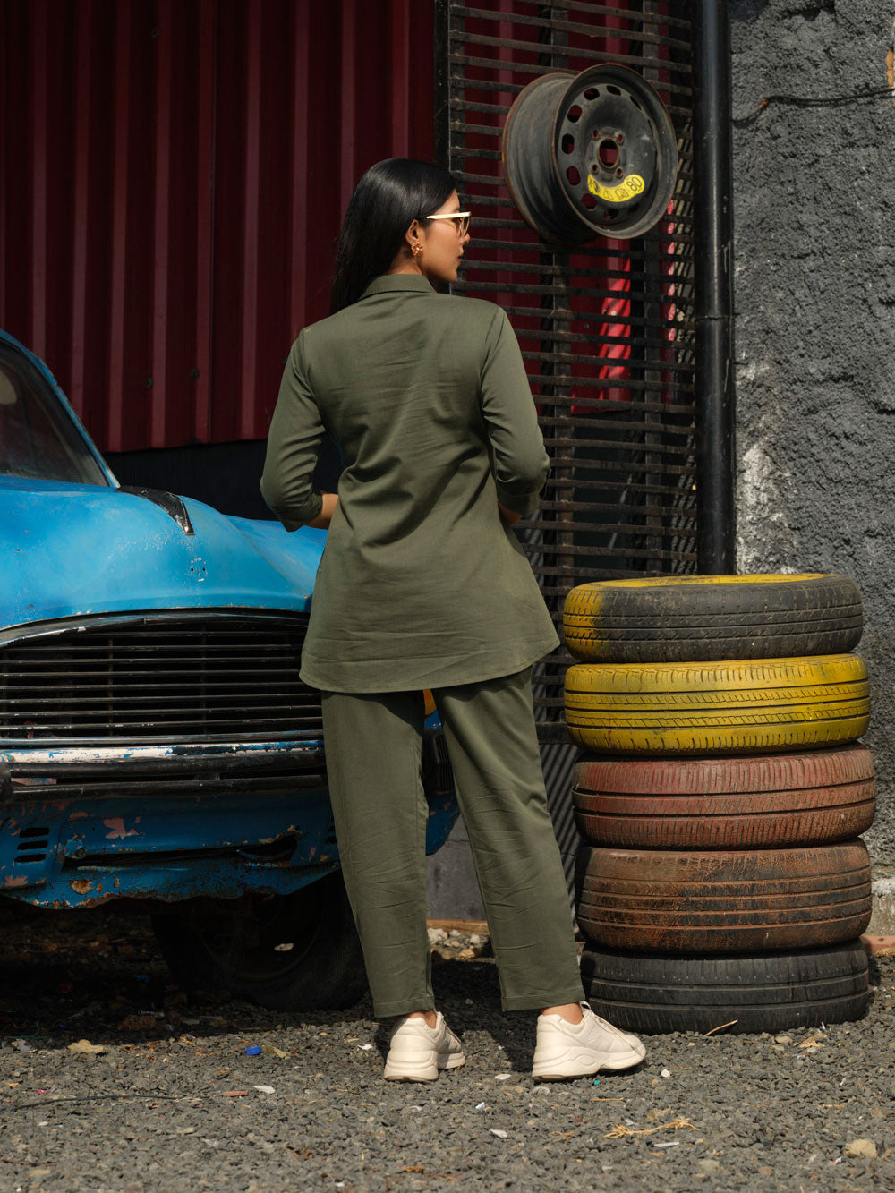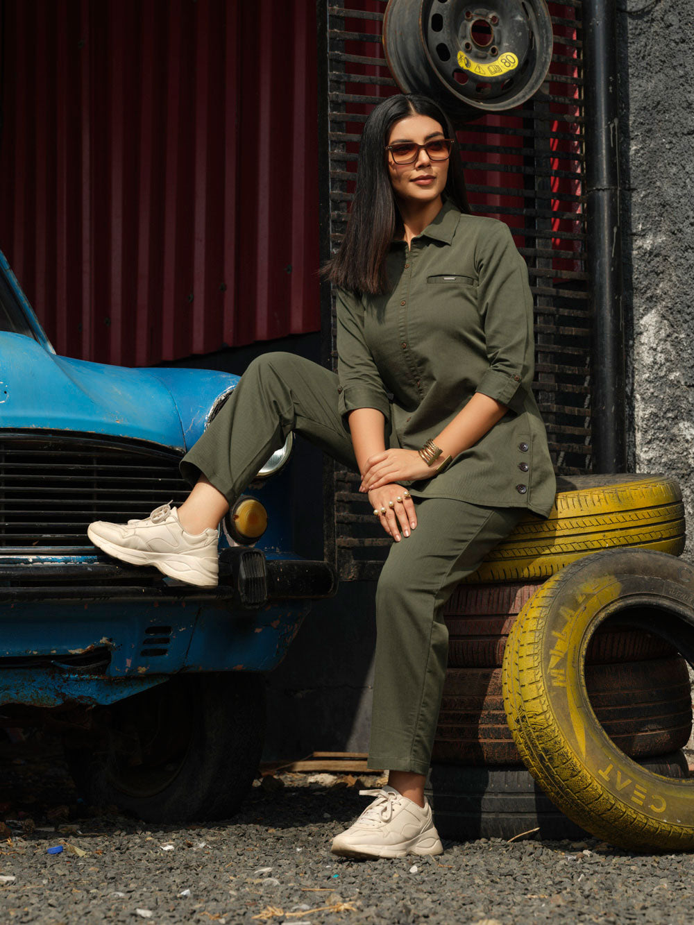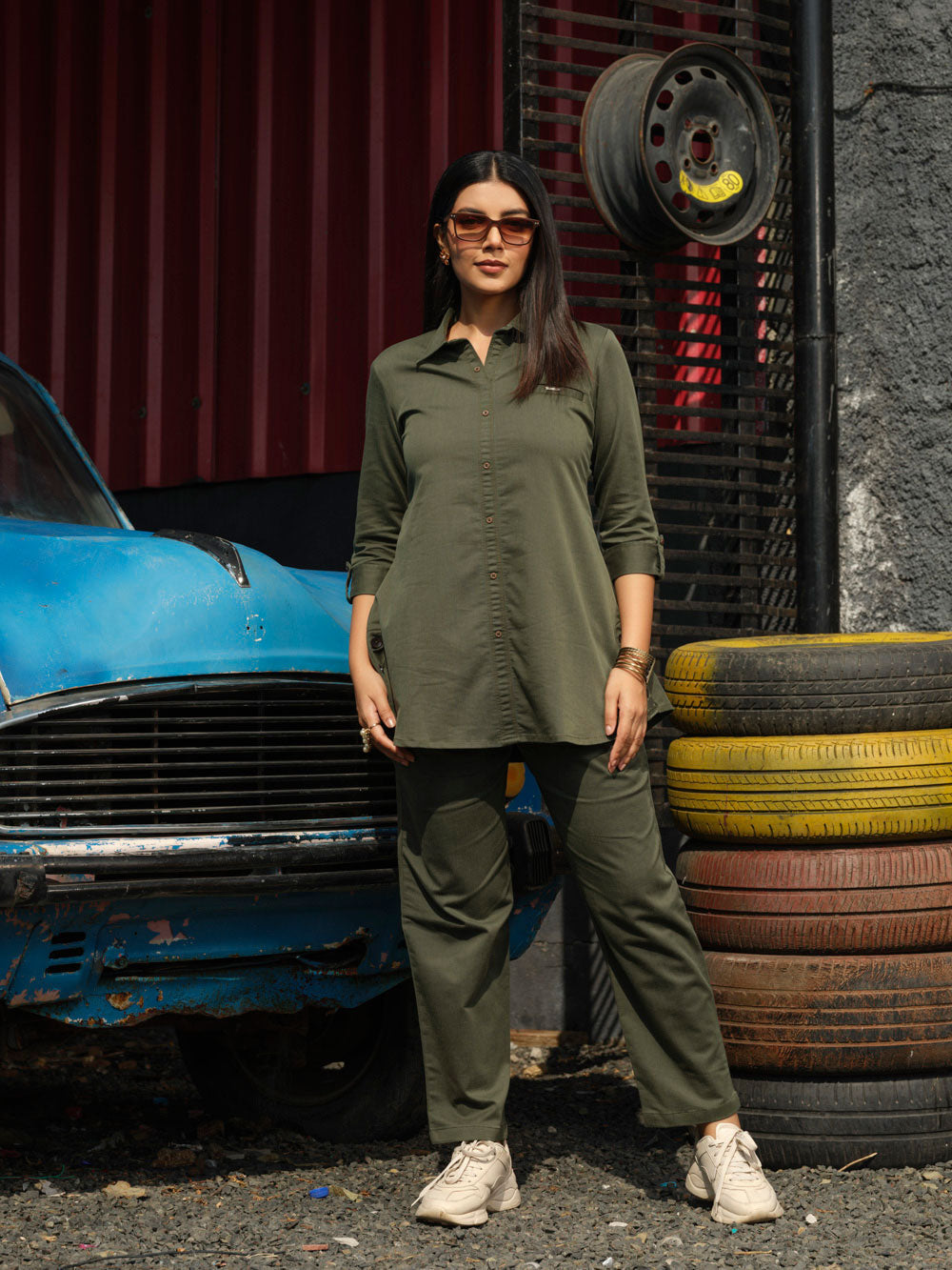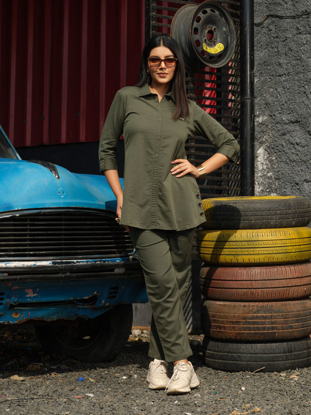 Tiered of those Indigo Denims? Try out this coloured denim co-ordinate set in military green hue. The fabric has an ultimate stretch to let one work with ease all day long at office or while travelling. This coloured denim is treated with enzyme for softness. Shirt collar with side buttons gives it a sturdy and classy look. CO-Ordinate Set, Indigo Co-Ord Set, Shirt collar, 3/4 sleeves
