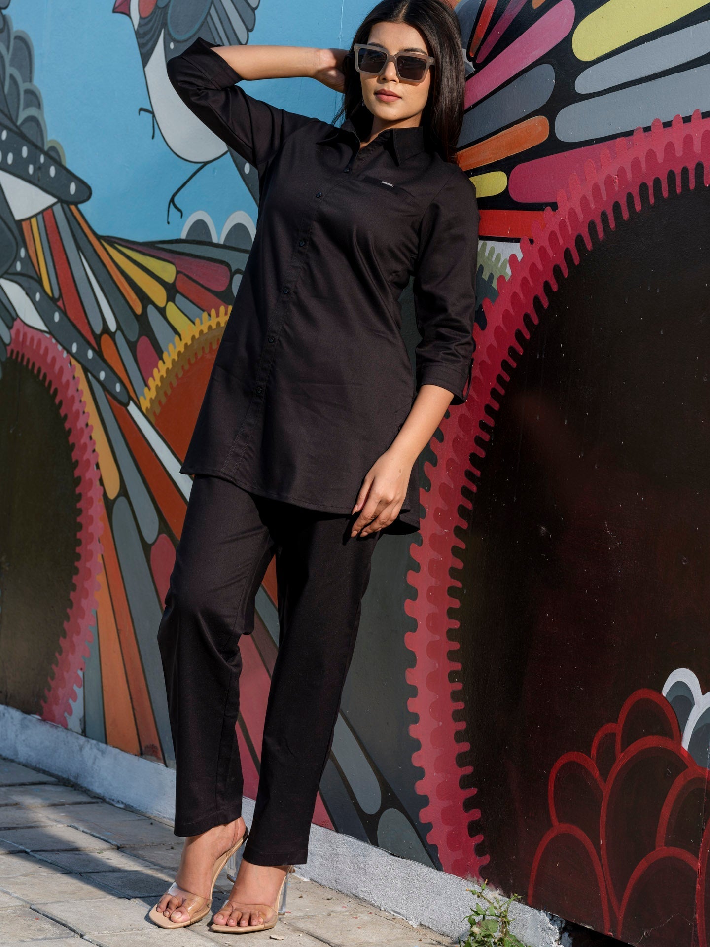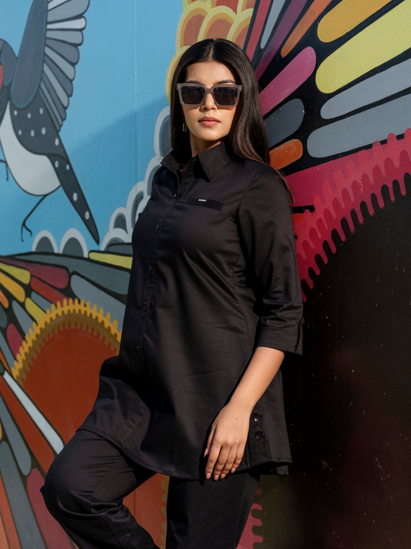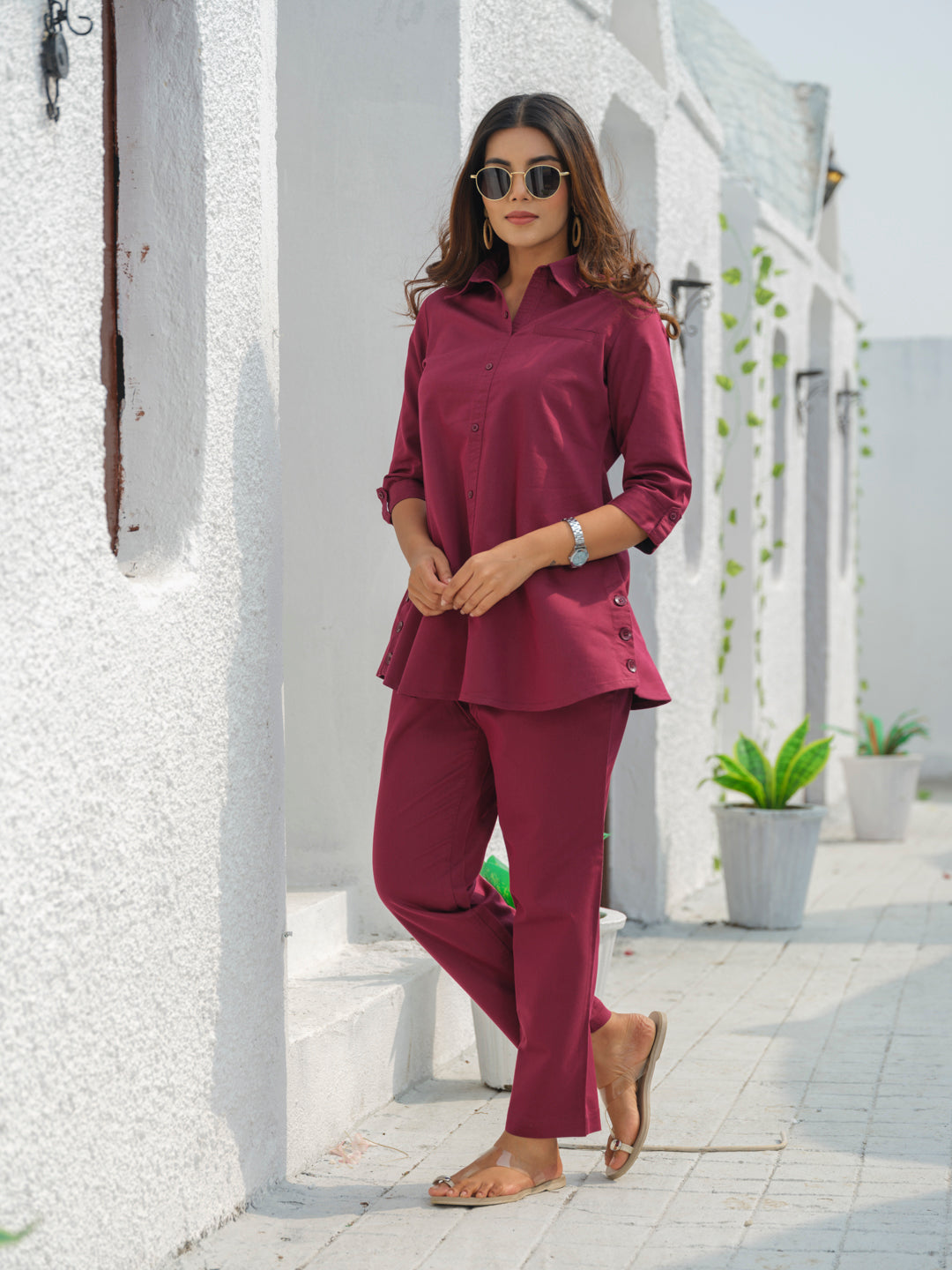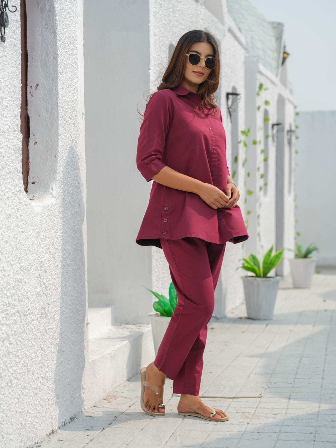 Tiered of those Indigo Denims? Try out this coloured denim co-ordinate set in military green hue. The fabric has an ultimate stretch to let one work with ease all day long at office or while travelling. This coloured denim is treated with enzyme for softness. Shirt collar with side buttons gives it a sturdy and classy look. CO-Ordinate Set, Indigo Co-Ord Set, Shirt collar, 3/4 sleeves