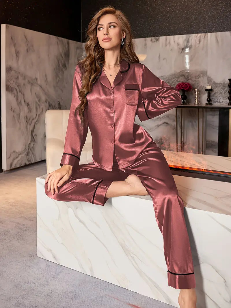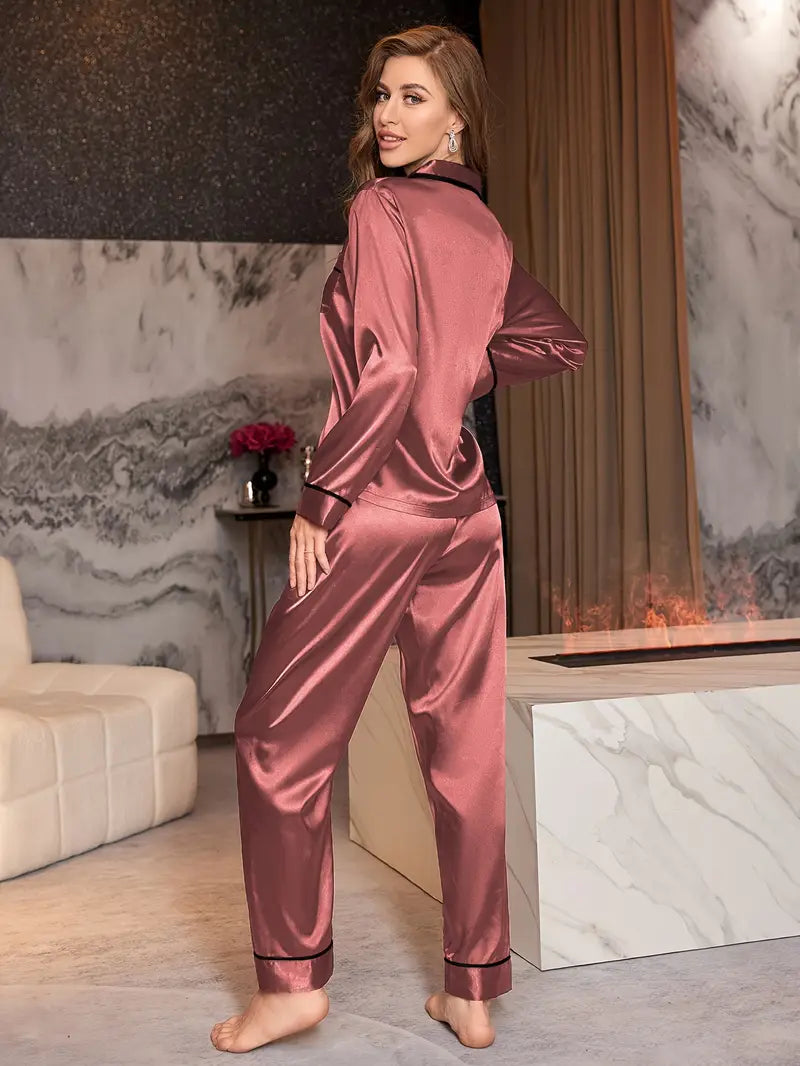 Indulge in the richness of comfort with our Luxe Lounge Dreams Co-ord Set – Rosewood. Made from silky smooth satin in a stunning rosewood hue, this luxe loungewear set features a button-down shirt with a notched collar, chest pocket, and sleek black contrast piping. The matching pants are designed with a relaxed fit and soft elastic waistband, offering a perfect blend of elegance and ease. Ideal for cozy nights, bridal prep, or stylish gifting—this set brings warmth and sophistication to your lounge wardrobe.