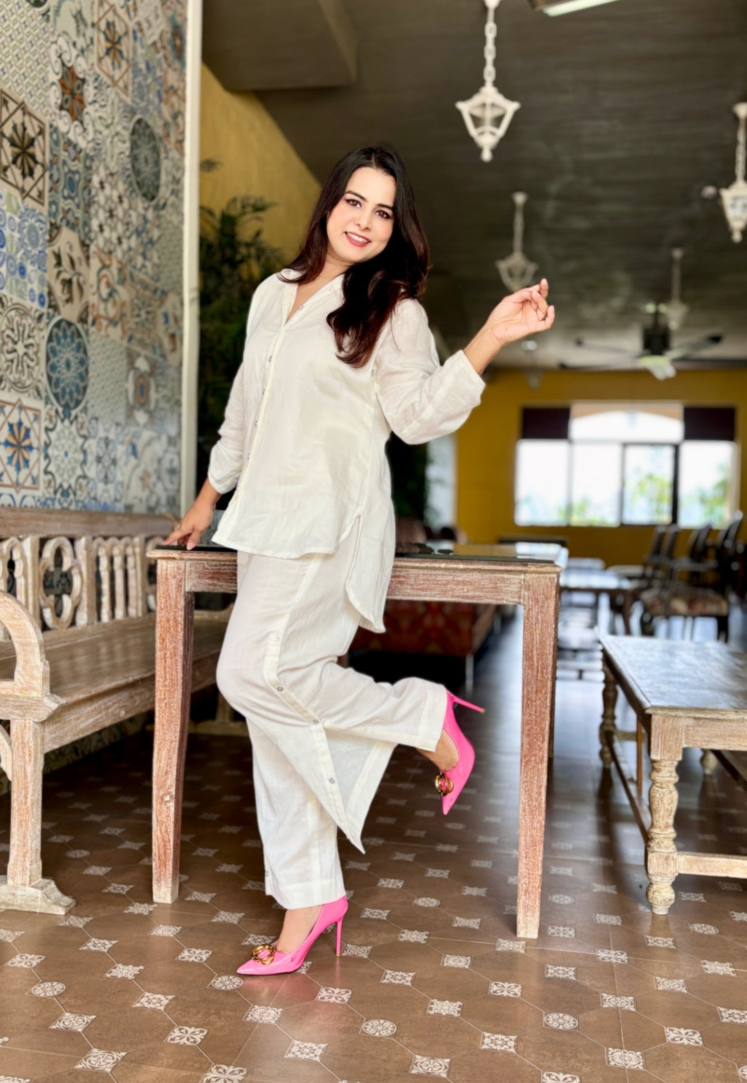 Clean, classic, and endlessly versatile—this white co-ord set is a wardrobe essential for lovers of elevated basics. Crafted from a soft cotton-lycra blend, it features statement button details and an easy silhouette designed for both style and comfort.